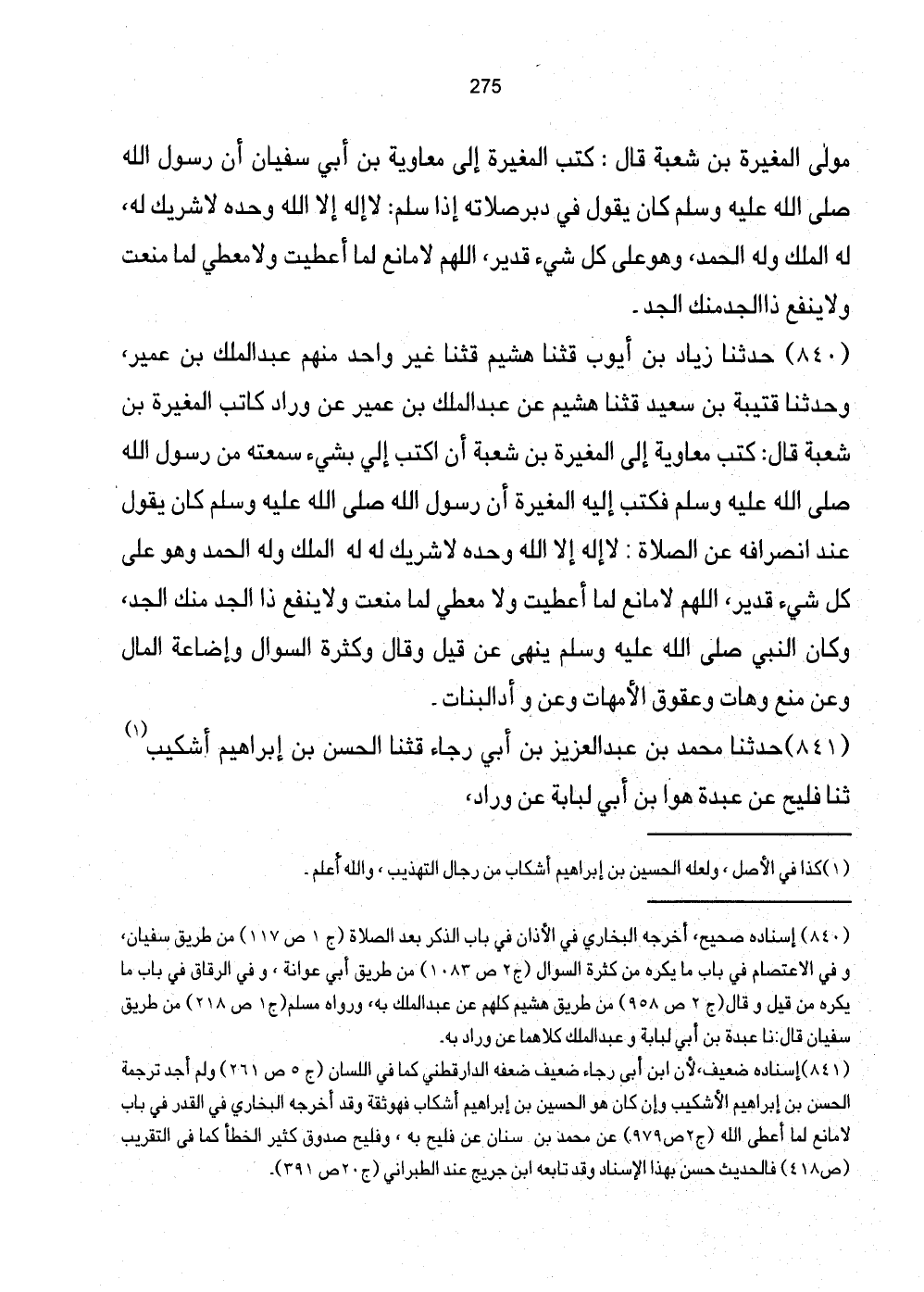 [841] إِسْنَاده ضَعِيف، لِأَن ابْن أبي رَجَاء ضَعِيف ضعفه الدَّارقطني كَمَا فِي اللِّسَان (ج5 ص261) وَلم أجد تَرْجَمَة الْحسن بن إِبْرَاهِيم الأشكيب وَإِن كَانَ هُوَ الْحسن بن إبراه أشكاب فَهُوَ ثِقَة وَقد أخرجه البُخَارِيّ فِي الْقدر فِي بَاب لَا مَانع لما أعْطى الله (ج2 ص979) عَن مُحَمَّد بن سِنَان عَن فليح بِهِ، صَدُوق كثير الْخَطَأ كَمَا فِي التَّقْرِيب (ص418) فَالْحَدِيث حسن بِهَذَا الْإِسْنَاد وَقد تَابعه ابْن جريج عَن الطَّبَرَانِيّ (ج20 ص391) .
