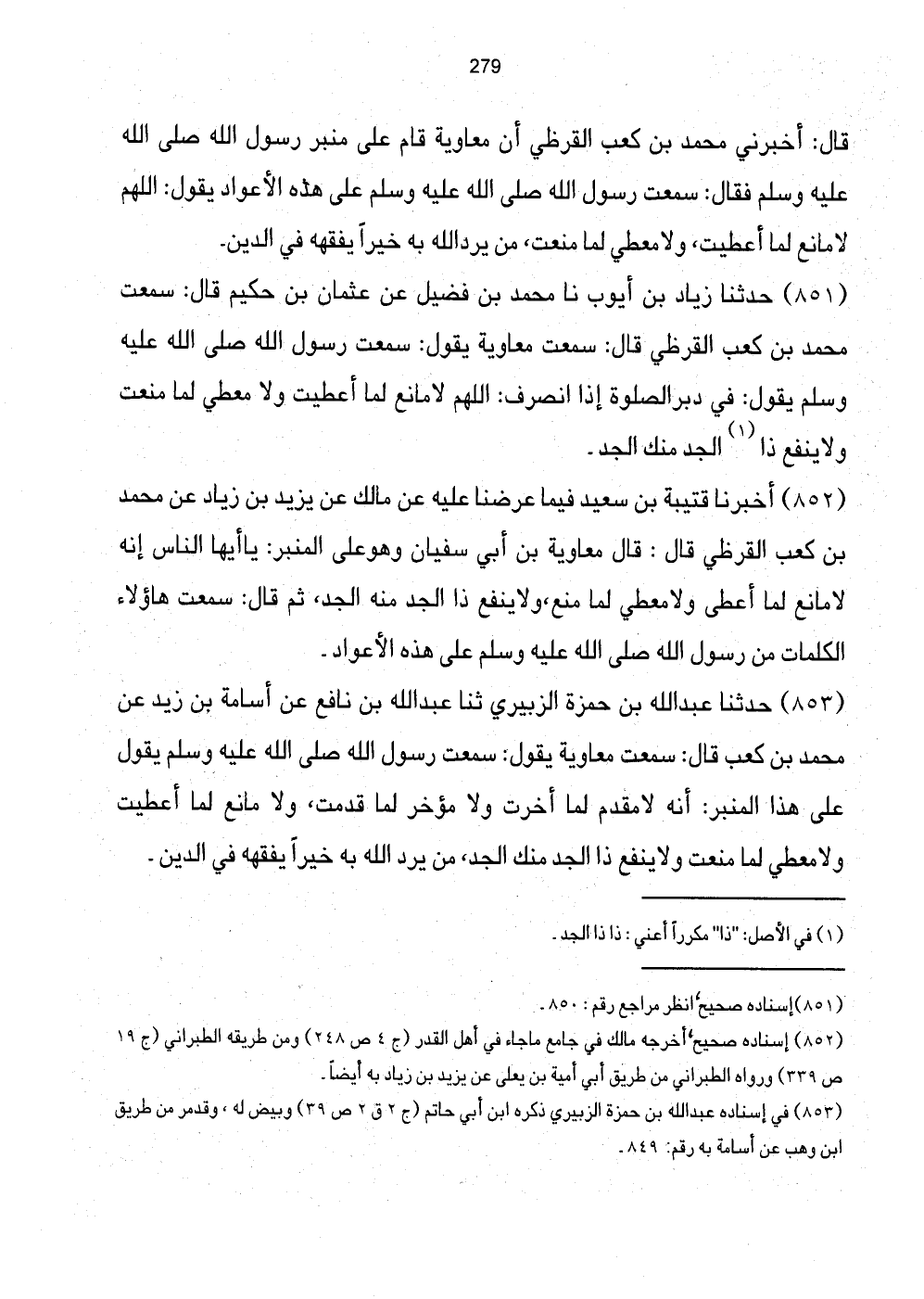 851 - حَدَّثَنَا زِيَادُ بن أَيُّوب نَا مُحَمَّدُ بْنُ فُضَيْلٍ عَن عُثْمَان بِحَكِيم قَالَ: سَمِعْتُ مُحَمَّدَ بْنَ كَعْبٍ الْقُرَظِيَّ قَالَ: سَمِعْتُ مُعَاوِيَةَ يَقُولُ: سَمِعْتُ رَسُولَ اللَّهِ صَلَّى اللهُ عَلَيْهِ وَسَلَّمَ يَقُولُ: فِي دُبُرِ الصَّلَوَاتِ إِذَا انْصَرَفَ: اللَّهُمَّ لَا مَانِعَ لِمَا أَعْطَيْتَ وَلا مُعْطِيَ لِمَا مَنَعْتَ وَلا يَنْفَعُ ذَا (1) الْجَدِّ مِنْكَ الْجَدُّ.