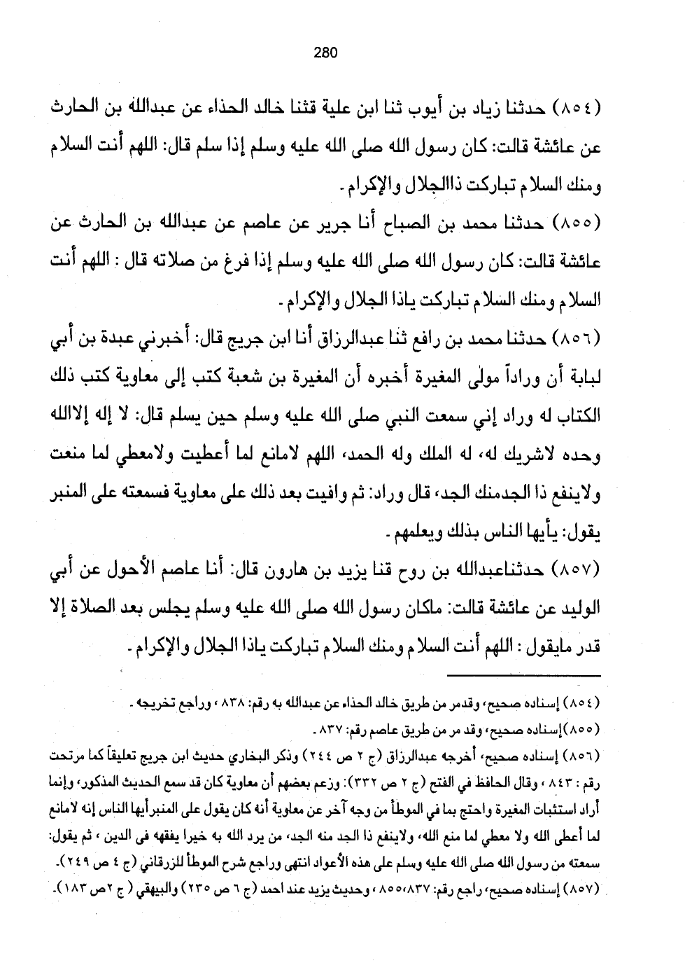 855 - حَدَّثَنَا مُحَمَّدُ بن الصَّباح أَن جَرِيرٌ عَنْ عَاصِمٍ عَنْ عَبْدِ اللَّهِ بْنِ الْحَارِثِ عَنْ عَائِشَةَ قَالَتْ: كَانَ رَسُول لله صَلَّى اللهُ عَلَيْهِ وَسَلَّمَ إِذَا فَرَغَ مِنْ صَلاتِهِ قَالَ: اللَّهُمَّ أَنْتَ السَّلامُ وَمِنْكَ السَّلامُ تَبَارَكْتَ يَا ذَا الْجَلالِ وَالإِكْرَامِ.