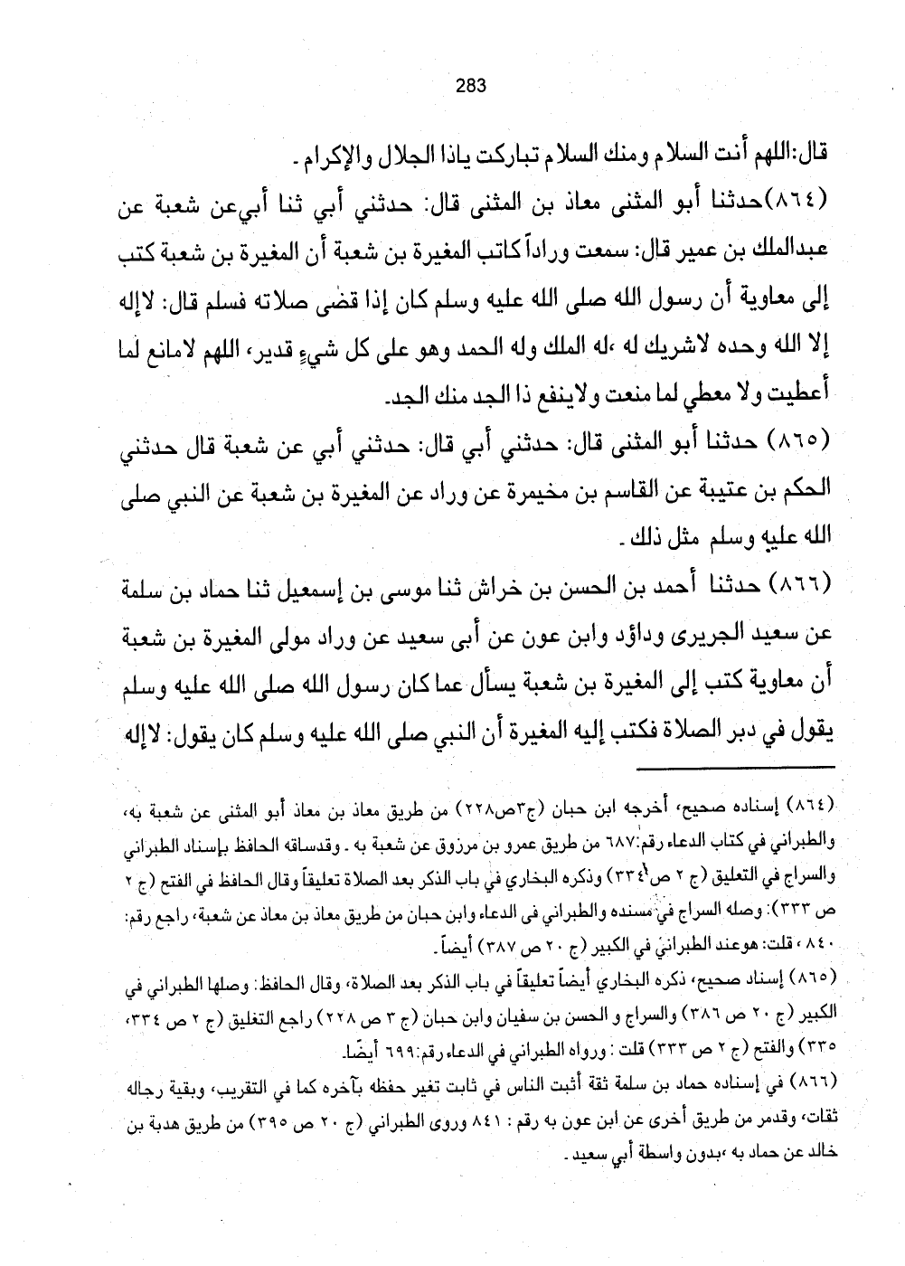 [864] إِسْنَاده صَحِيح، أخرجه ابْن حبَان (ج3 ص228) من طَرِيق معَاذ بن معَاذ أَبُو الْمثنى عَن شُعْبَة بِهِ، وَالطَّبَرَانِيّ فِي كتاب الدُّعَاء رقم: 687 من طَرِيق عَمْرو بن مَرْزُوق عَن شُعْبَة بِهِ. وَقد سَاقه الْحَافِظ بِإِسْنَاد الطَّبَرَانِيّ والسراج فِي التَّعْلِيق (ج2 ص334) وَذكره البُخَارِيّ فِي بَاب الذّكر بعد الصَّلَاة تَعْلِيقا وَقَالَ الْحَافِظ فِي الْفَتْح (ج2 ص333) : وصلَة السراج فِي مُسْنده وَالطَّبَرَانِيّ فِي الدُّعَاء وَابْن حبَان من طَرِيق معَاذ بن معَاذ عَن شُعْبَة، رَاجع رقم: 840، قلت: هُوَ عِنْد الطَّبَرَانِيّ فِي الْكَبِير (ج20 ص387) أَيْضا.