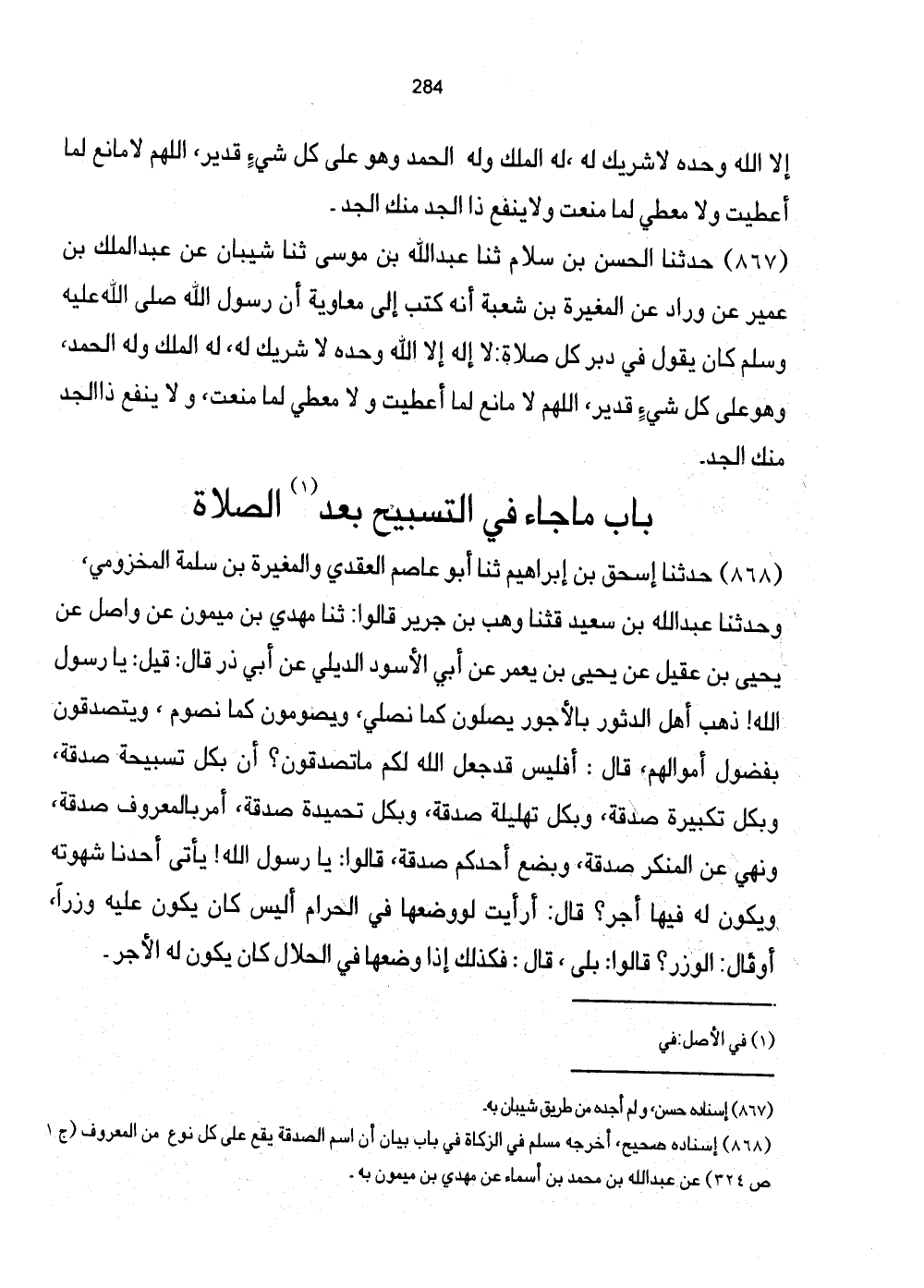867 - حَدَّثَنَا الْحَسَنُ بْنُ سَلامٍ ثَنَا عَبْدُ اللَّهِ بْنُ مُوسَى ثَنَا شَيْبَانُ عَنْ عَبْدِ الْمَلِكِ بْنِ عُمَيْرٍ عَنْ وَرَّادٍ عَنِ الْمُغِيرَةِ بْنِ شُعْبَةَ أَنَّهُ كَتَبَ إِلَى مُعَاوِيَة أَو رَسُولَ اللَّهِ صَلَّى اللهُ عَلَيْهِ وَسَلَّمَ كَانَ يَقُولُ فِي دُبُرِ كُلِّ صَلاةٍ: لَا إِلَهَ إِلا اللَّهُ وَحْدَهُ لَا شَرِيكَ لَهُ، لَهُ الْمُلْكُ وَلَهُ الْحَمْدُ، وَهُوَ عَلَى كُلِّ شَيْءٍ قَدِيرٍ، اللَّهُمَّ لَا مَانِعَ لِمَا أَعْطَيْتَ وَلا مُعْطِيَ لِمَا مَنَعْتَ، وَلا يَنْفَعُ ذَا الْجَدِّ مِنْكَ الْجَدُّ.