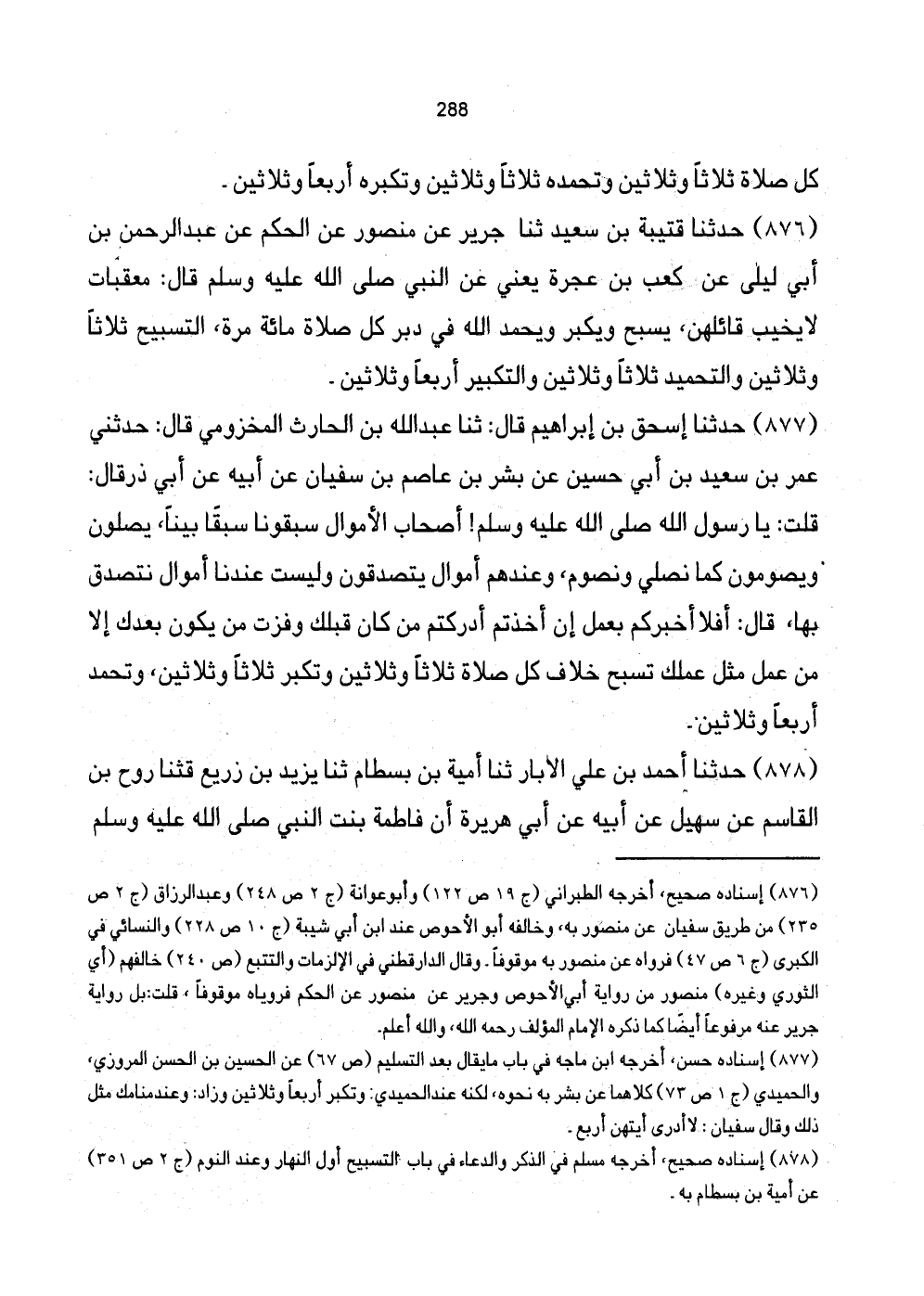 876 - حَدَّثَنَا قُتَيْبَةُ بْنُ سَعِيدٍ ثَنَا جَرِيرٌ عَنْ مَنْصُورٍ عَنِ الْحَكَمِ عَنْ عَبْدِ الرَّحْمَنِ بْنِ أَبِي لَيْلَى عَنْ كَعْبِ بْنِ عُجْرَةَ يَعْنِي عَنِ النَّبِي صَلَّى اللهُ عَلَيْهِ وَسَلَّمَ قَالَ: معقابات لَا يَخِيبُ قَائِلُهُنَّ، يُسَبِّحُ وَيُكَبِّرُ وَيَحْمَدُ اللَّهَ فِي دُبُرِ كُلِّ صَلاةٍ مِائَةَ مَرَّةٍ، التَّسْبِيحُ ثَلاثًا وَثَلاثِينَ وَالتَّحْمِيدُ ثَلاثًا وَثَلاثِينَ وَالتَّكْبِيرُ أَرْبَعًا وَثَلَاثِينَ.