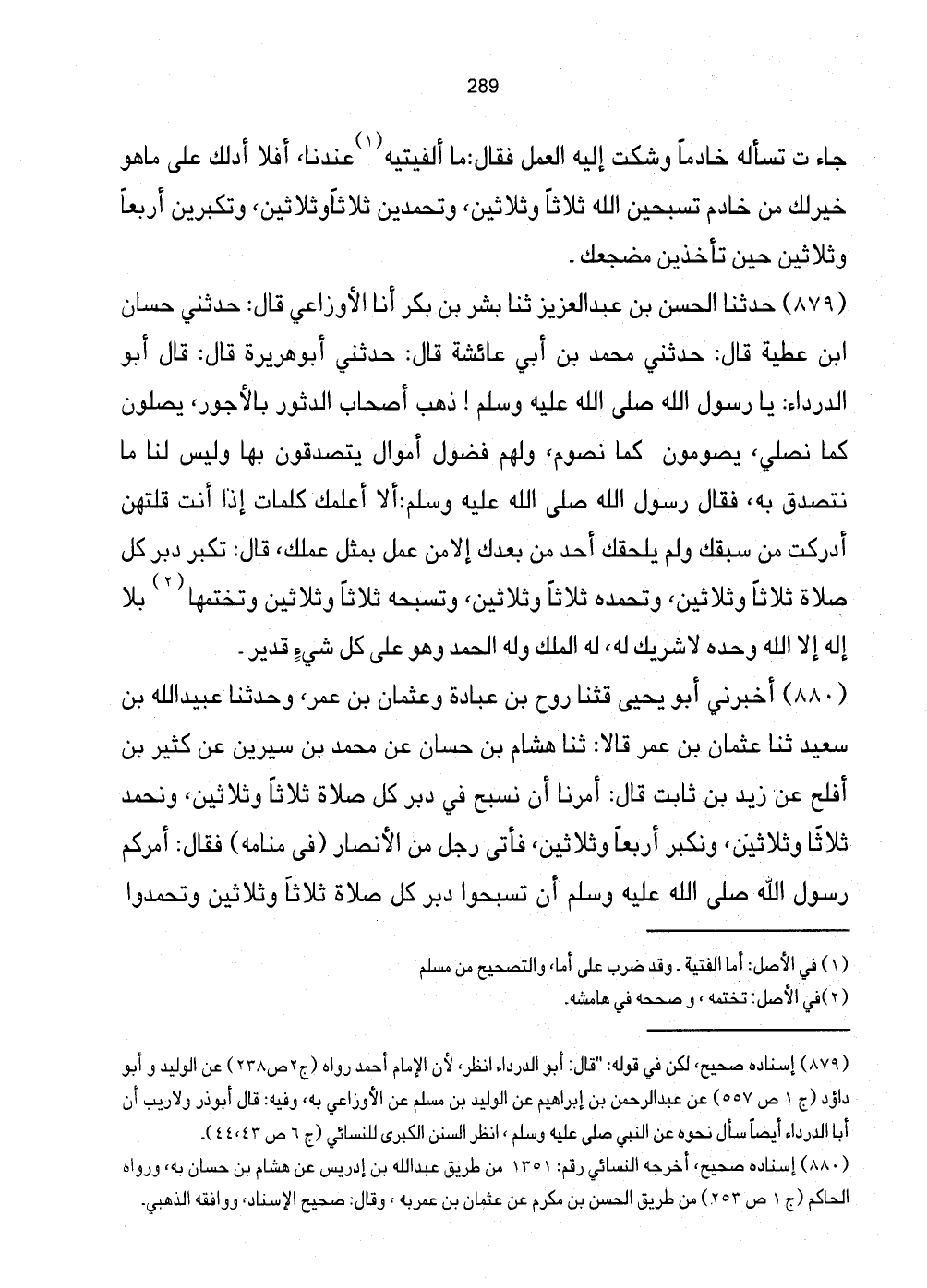 879 - حَدَّثَنَا الْحَسَنُ بْنُ عَبْدِ الْعَزِيزِ ثَنَا بِشْرُ بْنُ بَكْرٍ أَنَا الأَوْزَاعِيُّ قَالَ: حَدَّثَنِي حَسَّانُ ابْن عَطِيَّةَ قَالَ: حَدَّثَنِي مُحَمَّدُ بْنُ أَبِي عَائِشَة قَالَ: حدني أَبُو هُرَيْرَةَ قَالَ: قَالَ أَبُو الدَّرْدَاءِ: يَا رَسُولَ اللَّهِ صَلَّى اللهُ عَلَيْهِ وَسَلَّمَ! ذَهَبَ أَصْحَابُ الدُّثُورِ بِالأُجُورِ، يُصَلُّونَ كَمَا نصلي، يَصُومُونَ كَا نَصُومُ، وَلَهُمْ فُضُولُ أَمْوَالٍ يَتَصَدَّقُونَ بِهَا وَلَيْسَ لَنَا مَا نَتَصَدَّقُ بِهِ، فَقَالَ رَسُولُ اللَّهِ صَلَّى اللهُ عَلَيْهِ وَسَلَّمَ: أَلا أُعَلِّمُكَ كَلِمَاتٍ إِذَا أَنْتَ قُلْتَهُنَّ أَدْرَكْتَ مَنْ سَبَقَكَ وَلَمْ يَلْحَقْكَ أَحَدٌ مِنْ بَعْدِكَ إِلا مَنْ عَمِلَ بِمِثْلِ عَمَلِكَ، قَالَ: تُكَبِّرُ دُبُرَ كُلِّ صَلاةٍ ثَلاثًا وَثَلاثِينَ، وَتَحْمَدُهُ ثَلاثًا وَثَلاثِينَ، وَتُسَبِّحُ ثَلاثًا وَثَلاثِينَ وَتَخْتِمُهَا (2) بِلا إِلَهَ إِلا اللَّهُ وَحْدَهُ لَا شَرِيكَ لَهُ، لَهُ الْمُلْكُ وَلَهُ الْحَمْدُ وَهُوَ عَلَى كُلِّ شَيْءٍ قَدِيرٍ.