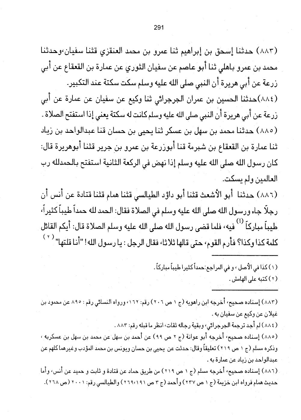 [886] إِسْنَاده صَحِيح، أخرجه مُسلم (ج1 ص219) من طَرِيق حَمَّاد عَن قَتَادَة وثابت وَحميد عَن أنس، وَأما حَدِيث همام فَرَوَاهُ ابْن خُزَيْمَة (ج1 ص237) وَأحمد (ج3 ص191، 269) وَالطَّيَالِسِي رقم: 2001 (ص268) .