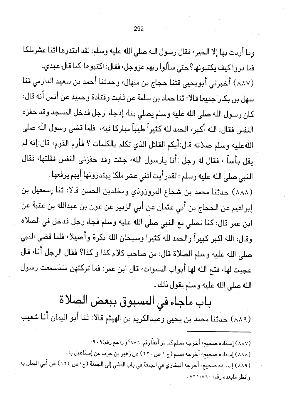 888 - حَدَّثَنَا مُحَمَّدُ بن شُجَاع المروزوذي وَمَخْلَدُ بْنُ الْحَسَنِ قَالا: ثَنَا إِسْمَاعِيلُ بْنُ إِبْرَاهِيمَ عَنِ الْحَجَّاجِ بْنِ أَبِي عُثْمَانَ عَنْ أَبِي الزُّبَيْرِ عَنْ عَوْنِ بْنِ عَبْدِ اللَّهِ بْنِ عُتْبَةَ عَنِ ابْنِ عُمَرَ قَالَ: كُنَّا نُصَلِّي مَعَ النَّبِيِّ صَلَّى اللهُ عَلَيْهِ وَسَلَّمَ فَجَاءَ رَجُلٌ فَدَخَلَ فِي الصَّلاةِ وَقَالَ: اللَّهُ أَكْبَرُ كَبِيرًا وَالْحَمْدُ لِلَّهِ كَثِيرًا وَسُبْحَانَ اللَّهِ بُكْرَةً وَأَصِيلا، فَلَمَّا قَضَى النَّبِيُّ صَلَّى اللهُ عَلَيْهِ وَسَلَّمَ قَالَ: مَا صَاحِبُ كَلامِ كَذَا وَكَذَا؟ فَقَالَ الرَّجُلُ أَنَا، قَالَ عَجِبْتُ لَهَا، فَتَحَ اللَّهُ لَهَا أَبْوَابَ السَّمَوَاتِ، قَالَ ابْنُ عُمَرَ: فَمَا تَرَكْتُهُنَّ مُنْذُ سَمِعْتُ رَسُولَ اللَّهِ صَلَّى اللهُ عَلَيْهِ وَسَلَّمَ يَقُولُ ذَلِكَ.