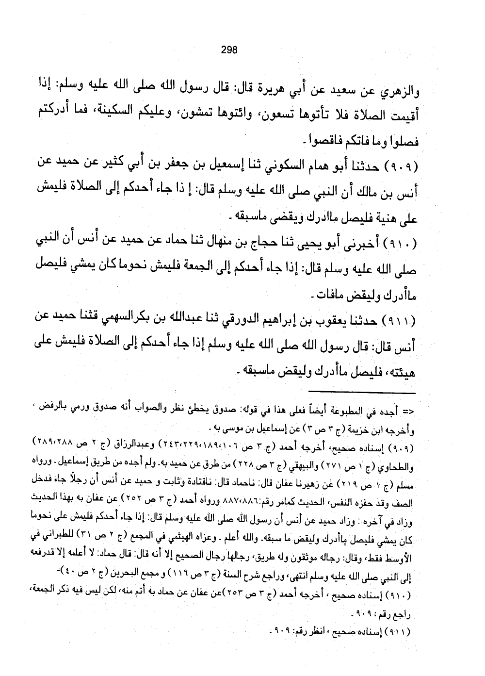 [909] إِسْنَاده صَحِيح، أخرجه أَحْمد (ج3 ص106، 189، 229، 243) وَعبد الرَّزَّاق (ج2 ص288، 289) والطَّحَاوِي (ج1 ص271) وَالْبَيْهَقِيّ (ج3 ص228) من طرق عَن حميد بِهِ. وَلم أَجِدهُ من طَرِيق إِسْمَاعِيل. وَرَوَاهُ مُسلم (ج1 ص219) عَن زهيرنا عَفَّان قَالَ: نَا حَمَّاد قَالَ: نَا قَتَادَة وثابت وَحميد عَن أنس أَن رجلا جَاءَ فَدخل الصَّفّ وَقد حفزه النَّفس، الحَدِيث كَمَا مر رقم: 886، 887 وَرَوَاهُ أَحْمد (ج3 ص252) عَن عَفَّان بِهَذَا الحَدِيث وَزَاد فِي آخِره: وَزَاد حميد عَن أنس أَن رَسُول الله صَلَّى اللهُ عَلَيْهِ وَسَلَّمَ قَالَ: إِذا جَاءَ أحدكُم فليمش على نَحْو مَا كَانَ يمشي فيصل مَا أدْرك وليقض مَا سبقه. وَالله أعلم. وَعَزاهُ الهيثمي فِي الْمجمع (ج2 ص31) للطبراني فِي الْأَوْسَط فَقَط، وَقَالَ: رِجَاله مؤثقون وَله طَرِيق، رجالها رجال الصَّحِيح إِلَّا أَنه قَالَ: قَالَ حَمَّاد: لَا أعلمهُ إِلَّا قد رَفعه إِلَى النَّبِي صَلَّى اللهُ عَلَيْهِ وَسَلَّمَ أنْتَهى، وراجع شرح السّنة (ج3 ص116) وَمجمع الْبَحْرين (ج2 ص40) .