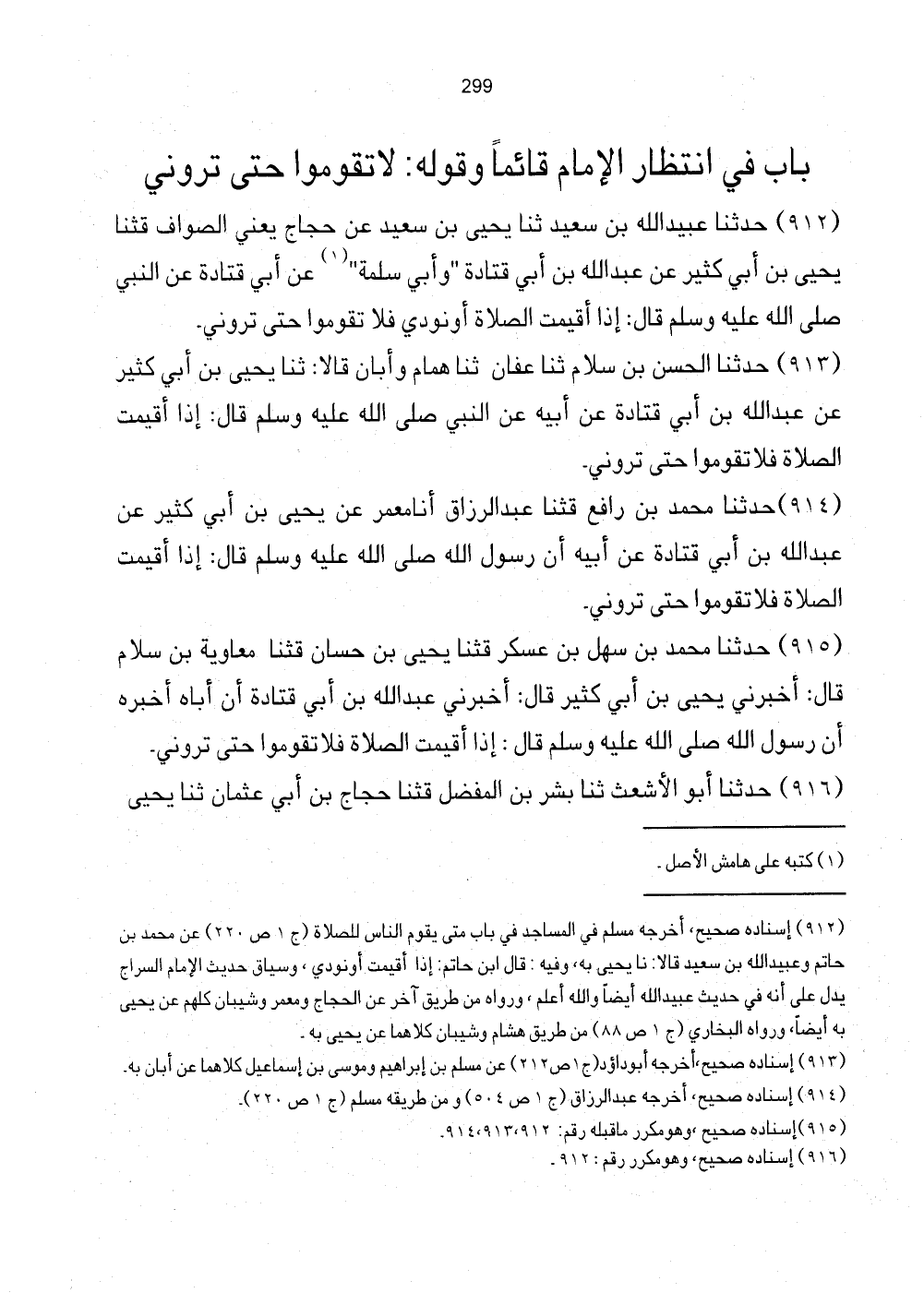 [912] إِسْنَاده صحي، أخرجه مُسلم فِي الْمَسَاجِد فِي بَاب مَتى يقوم النَّاس للصَّلَاة (ج1 ص220) عَن مُحَمَّد بن حَاتِم وَعبيد الله بن سعيد قَالَا: نَا يحيى بِهِ، وَفِيه: قَالَ ابْن حَاتِم: إِذا أُقِيمَت أَو نُودي، وَسِيَاق حَدِيث الإِمَام السراج يدل على أَنه فِي حَدِيث عبيد الله أَيْضا وَالله أعلم، وَرَوَاهُ من طَرِيق آخر عَن الْحجَّاج وَمعمر وشيبان كلهم عَن يحيى بِهِ أَيْضا، وَرَوَاهُ البُخَارِيّ (ج1 ص88) من طَرِيق هِشَام وشيبان كِلَاهُمَا عَن يحيى بِهِ.