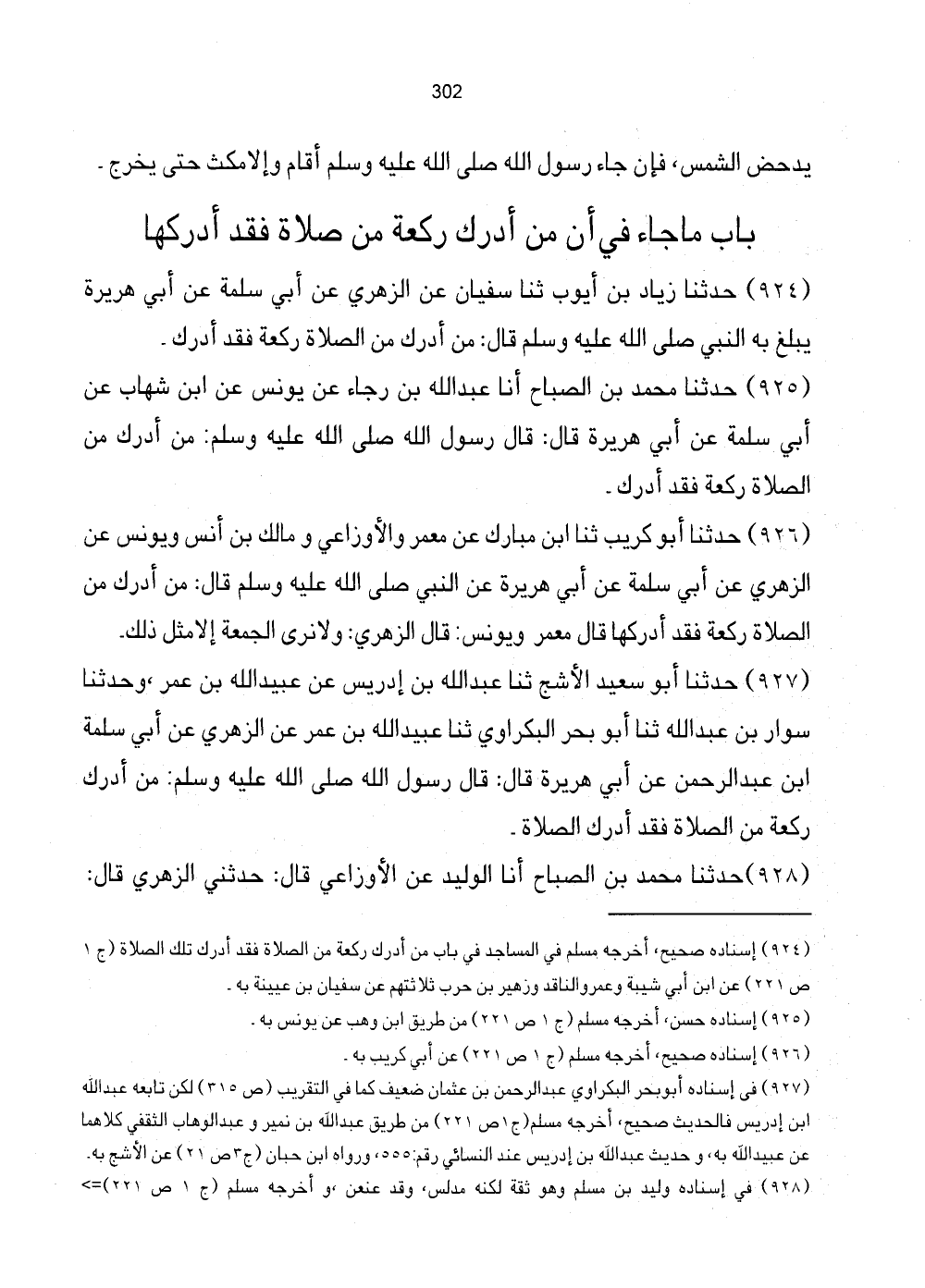 [924] إِسْنَاده صَحِيح، أخرجه مُسلم فِي الْمَسَاجِد فِي بَاب من أدْرك رَكْعَة من الصَّلَاة فقد أدْرك تِلْكَ الصَّلَاة (ج1 ص211) عَن ابْن أبي شيبَة وَعَمْرو النَّاقِد وَزُهَيْر بن حَرْب ثَلَاثَتهمْ عَن سُفْيَان بن عُيَيْنَة بِهِ.