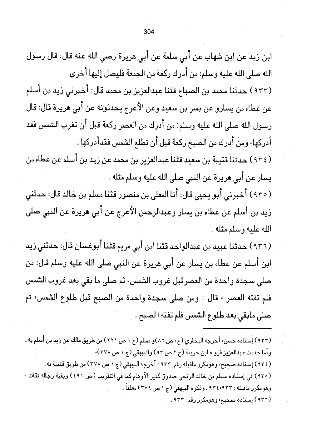 933 - حَدَّثَنَا مُحَمَّدُ بن الصَّباح قثنا عَبْدُ الْعَزِيزِ بْنُ مُحَمَّدٍ قَالَ: أَخْبَرَنِي زَيْدُ بْنُ أَسْلَمَ عَنْ عَطاء بن يسارو عَن بِسْرِ بْنِ سَعِيدٍ وَعَنِ الأَعْرَجِ يُحَدِّثُونَهُ عَنْ أَبِي هُرَيْرَةَ قَالَ: قَالَ رَسُولُ اللَّهِ صَلَّى اللهُ عَلَيْهِ وَسَلَّمَ: مَنْ أَدْرَكَ الْعَصْرَ رَكْعَةً قَبْلَ أَنْ تَغْرُبَ الشَّمْسَ فَقَدْ أَدْرَكَهَا، وَمَنْ أَدْرَكَ مِنَ الصُّبْحِ رَكْعَةً قَبْلَ أَنْ تَطْلُعَ الشَّمْسَ قَدْ أَدْرَكَهَا.