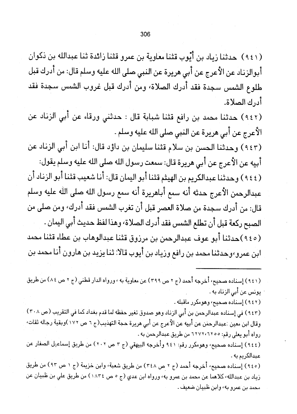 [941] إِسْنَاده صَحِيح، أخرجه أَحْمد (ج2 ص399) عَن مُعَاوِيَة بِهِ، وَرَوَاهُ الدَّارقطني (ج2 ص84) من طَرِيق يُونُس عَن أبي الزِّنَاد بِهِ.