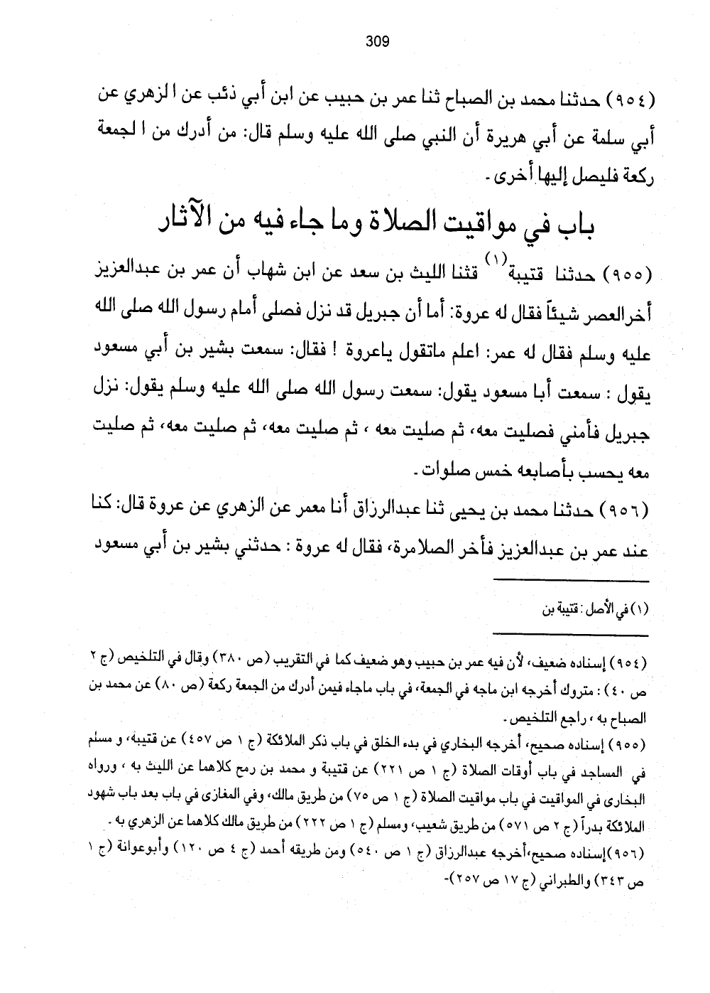 955 - حَدثنَا قُتَيْبَة (1) قثنا اللَّيْثُ بْنُ سَعْدٍ عَنِ ابْنِ شِهَابٍ أَنَّ عُمَرَ بْنَ عَبْدِ الْعَزِيز أخر العصور شَيْئًا فَقَالَ لَهُ عُرْوَةُ: أَمَا أَنَّ جِبْرِيلَ قِدْ نَزَلَ فَصَلَّى أَمَامَ رَسُولِ اللَّهِ صَلَّى اللهُ عَلَيْهِ وَسَلَّمَ فَقَالَ لَهُ عُمَرُ: اعْلَمْ مَا تَقُولُ يَا عُرْوَةُ! فَقَالَ: سَمِعْتُ بَشِيرَ بْنَ أَبِي مَسْعُودٍ يَقُولُ: سَمِعْتُ أَبَا مَسْعُودٍ يَقُولُ: سَمِعْتُ رَسُولَ اللَّهِ صَلَّى اللهُ عَلَيْهِ وَسَلَّمَ يَقُولُ: نَزَلَ جِبْرِيلُ فَأَمَّنِي فَصَلَّيْتُ مَعَهُ، ثُمَّ صَلَّيْتُ مَعَهُ، ثُمَّ صَلَّيْتُ مَعَهُ، ثُمَّ صَلَّيْتُ مَعَهُ، ثُمَّ صَلَّيْتُ مَعَهُ يَحْسِبُ بَأَصَابِعِهِ خَمْسُ صَلَوَاتٍ.
