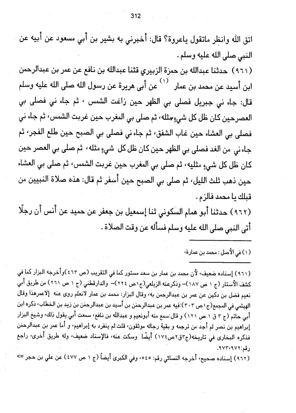[961] إِسْنَاده ضَعِيف، لِأَن مُحَمَّد بن عمار بن سعد مَسْتُور كَمَا فِي التَّقْرِيب (ص463) وَأخرجه الْبَزَّار كَمَا فِي كشف الأستار (ج1 ص187) - وَذكر عَنهُ الزَّيْلَعِيّ (ج1 ص224) - وَالدَّارقطني (ج1 ص261) من طَرِيق أبي نعيم فضل بن دُكَيْن عَن عمر بن عبد الرَّحْمَن بِهِ، وَقَالَ الْبَزَّار: مُحَمَّد بن عمار لَا نعلم روى عَنهُ إِلَّا عمر هَذَا وَقَالَ الهيثمي فِي الْمجمع (ج1 ص303) : فِيهِ عمر بن عبد الرَّحْمَن بن أسيد بن عبد الرَّحْمَن بن زيد بن الْخطاب، ذكره ابْن أبي حَاتِم (ج3 ق1 ص121) وَقَالَ: سمع مِنْهُ أَبُو نعيم وَعبد الله بن نَافِع، سَمِعت أبي يَقُول ذَلِك، وَشَيخ الْبَزَّار إِبْرَاهِيم بن نصر لم أجد من تَرْجمهُ وَبَقِيَّة رِجَاله موثقون، قلت: لم ينْفَرد بِهِ إِبْرَاهِيم، وَأما عمر بن عبد الرَّحْمَن فَذكره البُخَارِيّ فِي تَارِيخه (ج3 ق2 ص174) أَيْضا وَسكت عَنهُ، فالإسناد ضَعِيف، وَله طَرِيق أُخْرَى، رَاجع رقم: 972، 973.
