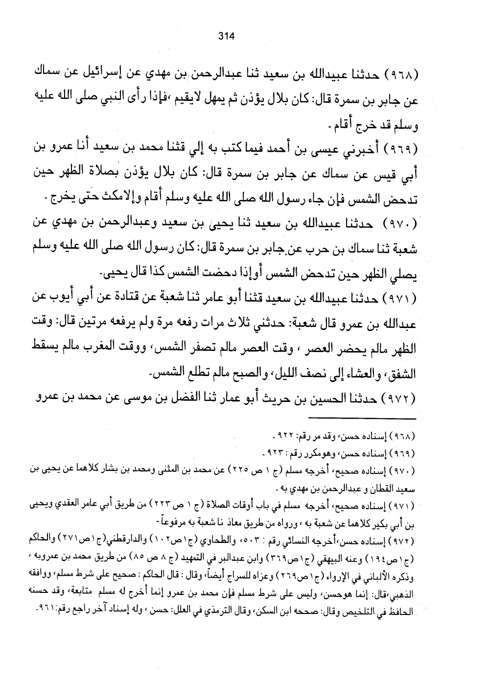 [972] إِسْنَاده حسن، أخرجه النَّسَائِيّ رقم: 503، والطَّحَاوِي (ج1 ص102) وَالدَّارقطني (ج1 ص271) وَالْحَاكِم (ج1 ص194) وَعنهُ الْبَيْهَقِيّ (ج1 ص369) وَابْن عبد الْبر فِي التَّمْهِيد (ج8 ص85) من طَرِيق مُحَمَّد بن عَمْرو بِهِ، (ج1 ص194) وَعنهُ الْبَيْهَقِيّ (ج1 ص369) وَابْن عبد الْبر فِي التَّمْهِيد (ج8 ص85) من طَرِيق مُحَمَّد بن عَمْرو بِهِ، وَذكره الألباني فِي الإرواء (ج1 ص269) وَعَزاهُ للسراج أَيْضا، وَقَالَ: قَالَ الْحُكَّام: صَحِيح على شَرط مُسلم، وَوَافَقَهُ الذَّهَبِيّ، قَالَ: إِنَّمَا هُوَ حسن، وَلَيْسَ على شَرط مُسلم فَإِن مُحَمَّد بن عَمْرو إِنَّمَا أخرجه لَهُ مُسلم مُتَابعَة، وَقد حسنه الْحَافِظ فِي التَّلْخِيص وَقَالَ: صَححهُ ابْن السكن، وَقَالَ التِّرْمِذِيّ فِي الْعِلَل: حسن، وَله إِسْنَاد آخر رَاجع رقم: 961.