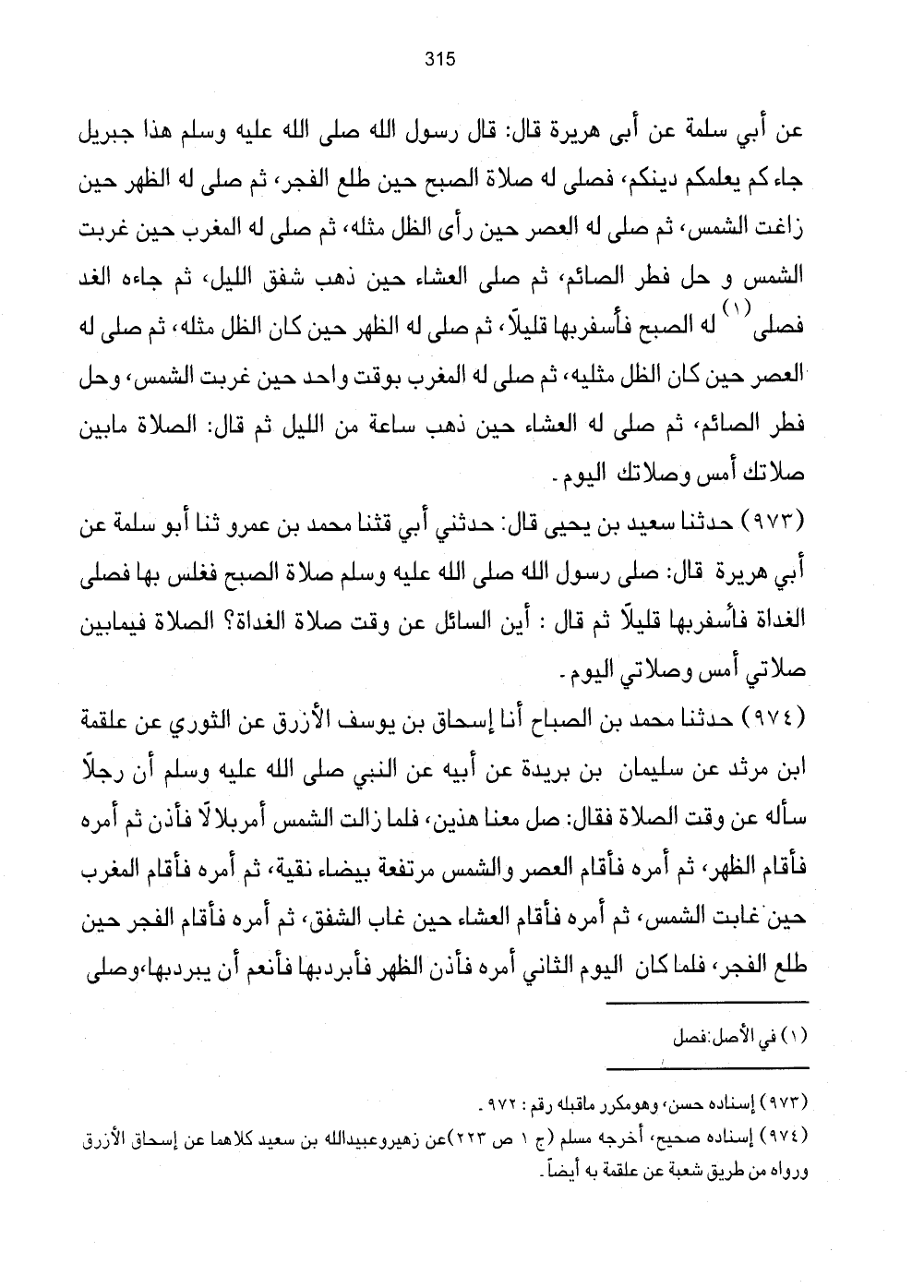 عَنْ أَبِي سَلَمَةَ عَنْ أَبِي هُرَيْرَةَ قَالَ: قَالَ رَسُولُ اللَّهِ صَلَّى اللهُ عَلَيْهِ وَسَلَّمَ هَذَا جِبْرِيلُ جَاءَكُمْ يُعَلِّمُكُمْ دِينَكُمْ، فَصَلَّى لَهُ صَلاةَ الصُّبْحِ حِينَ طَلَعَ الْفَجْرُ، ثُمَّ صَلَّى لَهُ الظّهْر حِين زاعت الشَّمْسُ، ثُمَّ صَلَّى لَهُ الْعَصْرَ حِينَ رَأَى الظِّلَّ مِثْلَهُ، ثُمَّ صَلَّى الْمَغْرِبَ حِينَ غَرُبَتِ الشَّمْسُ وَحَلَّ فِطْرُ الصَّائِمِ، ثُمَّ صَلَّى الْعِشَاءَ حِينَ ذَهَبَ شَفَقُ اللَّيْلِ، ثُمَّ جَاءَهُ الْغَدُ صَلَّى (1) لَهُ الصُّبْحَ فَأَسْفَرَ بِهَا قَلِيلًا، ثمَّ صلى الله لَهُ الظُّهْرَ حِينَ كَانَ الظِّلُّ مِثْلَهُ، ثُمَّ صَلَّى لَهُ الْعَصْرَ حِينَ كَانَ الظِّلُّ مِثْلَيْهِ، ثُمَّ صَلَّى لَهُ الْمَغْرِبَ بِوَقْتٍ وَاحِدٍ حِينَ غَرُبَتِ الشَّمْسُ، وَحَلَّ فِطْرُ الصَّائِمِ، ثُمَّ صَلَّى لَهُ الْعِشَاءَ حِينَ ذَهَبَ سَاعَةٌ مِنَ اللَّيْلِ ثُمَّ قَالَ: الصَّلاةُ مَا بَيْنَ صَلاتِكَ أَمْسُ وَصَلاتِكَ الْيَوْمُ.