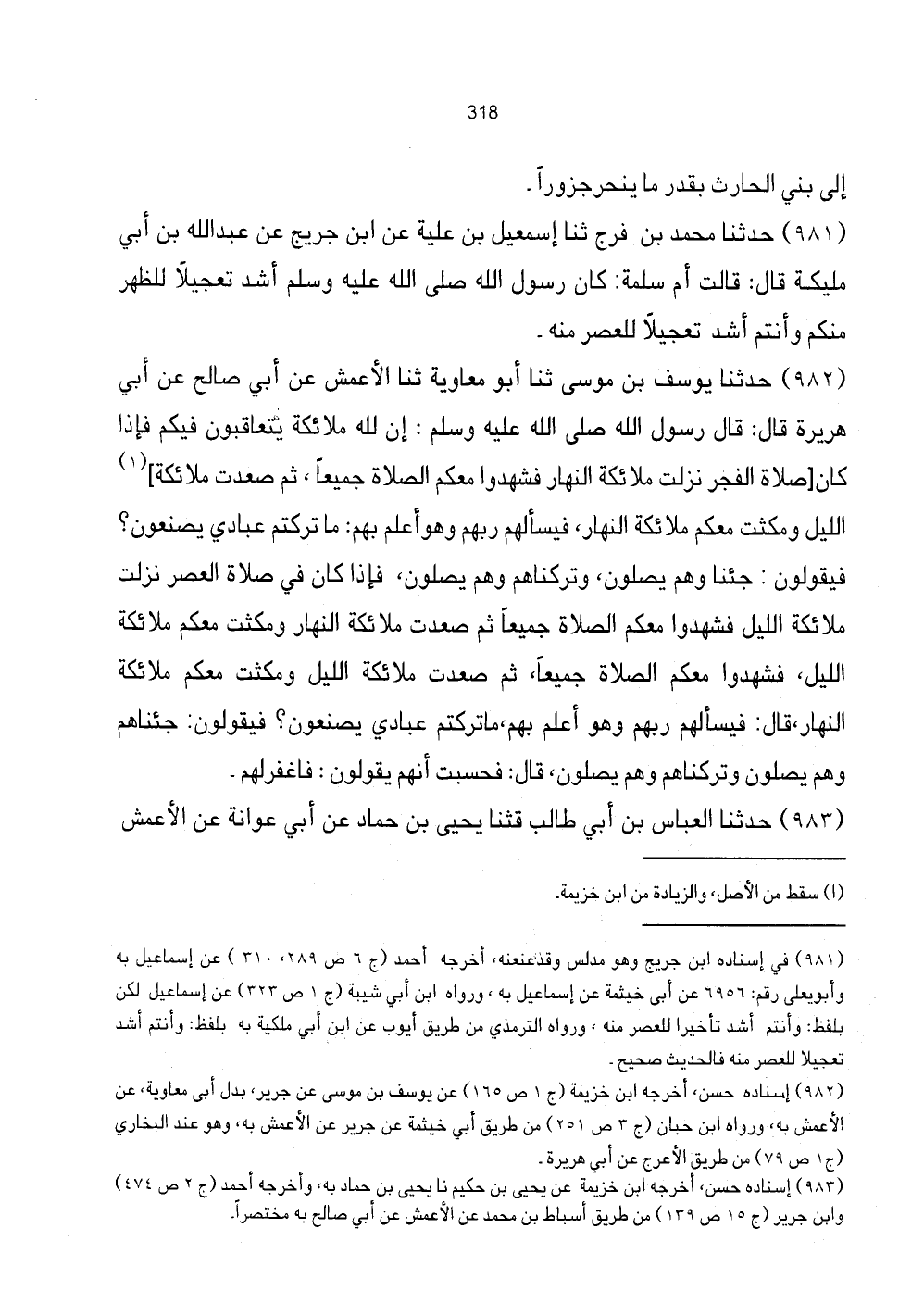 [981] فِي إِسْنَاده ابْن جريج وَهُوَ مُدَلّس وَقد عنعنه، أخرجه أَحْمد (ج1 ص289، 310) عَن إِسْمَاعِيل بِهِ وَأَبُو يعلى رقم: 6956 عَن أبي خَيْثَمَة عَن إِسْمَاعِيل بِهِ، وَرَوَاهُ ابْن أبي شيبَة (ج1 ص323) عَن إِسْمَاعِيل لَكِن بِلَفْظ: وَأَنْتُم أَشد تَأْخِيرا للعصر مِنْهُ، وَرَوَاهُ التِّرْمِذِيّ من طَرِيق أَيُّوب عَن ابْن أبي ملكية بِهِ بِلَفْظ: وَأَنْتُم أَشد تعجيلاً للعصر مِنْهُ فَالْحَدِيث صَحِيح.