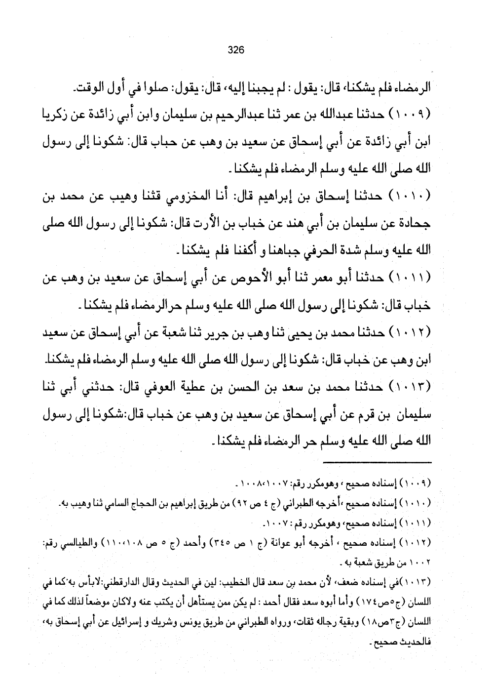 1011 - حَدَّثَنَا أَبُو مَعْمَرٍ ثَنَا أَبُو الأَحْوَصِ عَنْ أَبِي إِسْحَاقَ عَنْ سَعِيدِ بْنِ وَهْبٍ عَنْ خَبَّابٍ قَالَ: شَكَوْنَا إِلَى رَسُولِ الله صَلَّى اللهُ عَلَيْهِ وَسَلَّمَ حر المرضاء فَلَمْ يَشْكُنَا.