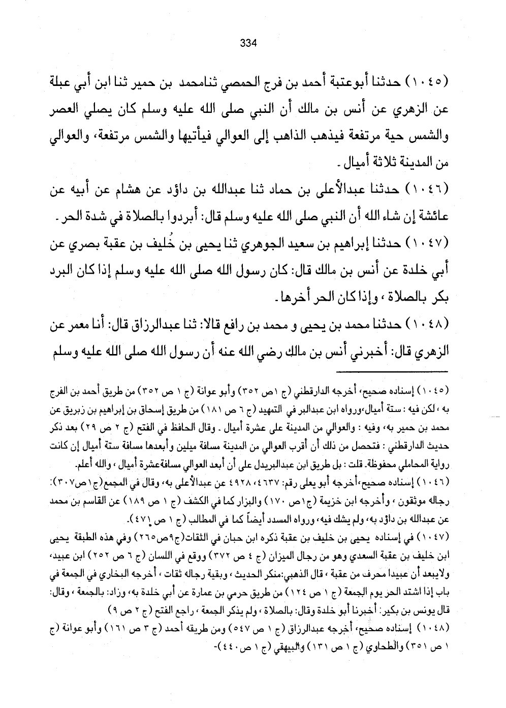 [1045] إِسْنَاده صَحِيح، أخرجه الدَّارقطني (ج1 ص352) وَأَبُو عوَانَة (ج1 ص352) من طَرِيق أَحْمد بن الْفرج بِهِ، لَكِن فِيهِ: سِتَّة أَمْيَال، وَرَوَاهُ ابْن عبد الْبر فِي التَّمْهِيد (ج6 ص181) من طَرِيق إِسْحَاق بن إِبْرَاهِيم بن زبريق عَن مُحَمَّد بن حمير بِهِ، وَفِيه: والعوالي من الْمَدِينَة على عشرَة أَمْيَال، وَقَالَ الْحَافِظ فِي الْفَتْح (ج2 ص29) بعد ذكر حَدِيث الدَّارقطني ك فَتحصل من ذَلِك أَن أقرب العوالي من الْمَدِينَة مَسَافَة ميلين وأبعدها مَسَافَة عشرَة أَمْيَال، وَالله أعلم.