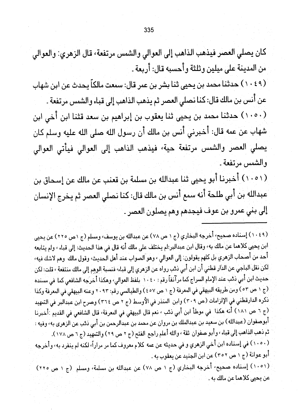 1051 - أَخْبَرَنَا أَبُو يَحْيَى ثَنَا عَبْدُ اللَّهِ بْنُ مَسْلَمَةَ بْنُ قَعْنَبٍ عَنْ مَالِكٍ عَنْ إِسْحَاقَ بْنِ عَبْدِ اللَّهِ بْنِ أَبِي طَلْحَةَ أَنَّهُ سَمِعَ أَنَسَ بْنَ مَالِكٍ قَالَ: كُنَّا نُصَلِّي الْعَصْرَ ثُمَّ يَخْرُجُ الإِنْسَانُ إِلَى بَنِي عَمْرِو بْنِ عَوْفٍ فَيَجِدُهُمْ وَهُمْ يُصَلُّونَ الْعَصْرَ.