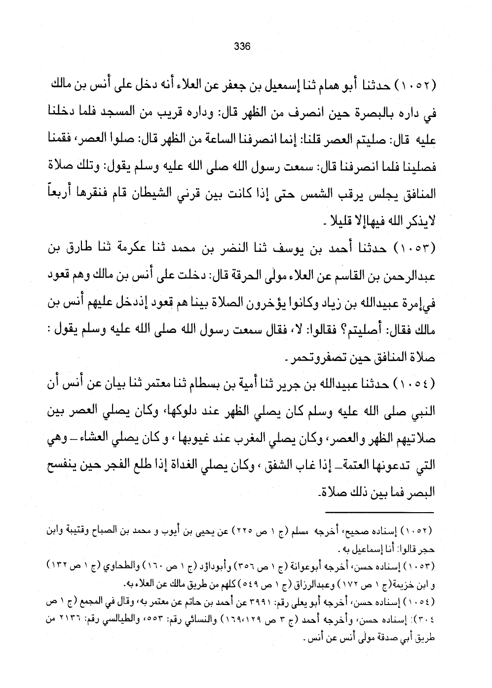 1052 - حَدَّثَنَا أَبُو هَمَّامٍ ثَنَا إِسْمَاعِيلُ بْنُ جَعْفَرٍ عَنِ الْعَلاءِ أَنَّهُ دَخَلَ عَلَى أَنَسِ بْنِ مَالِكٍ فِي دَارِهِ بِالْبَصْرَةِ حِينَ انْصَرَفَ مِنَ الظُّهْرِ قَالَ: وَدَارُهُ قَريِبٌ مِنَ الْمَسْجِدِ فَلَمَّا دَخَلْنَا عَلَيْهِ قَالَ: صَلَّيْتُمُ الْعَصْرَ قُلْنَا: إِنَّمَا انْصَرَفْنَا السَّاعَةَ مِنَ الظُّهْرِ قَالَ: صَلُّوا الْعَصْرَ، فَقُمْنَا فَصَلَّيْنَا فَلَمَّا انْصَرَفْنَا قَالَ: سَمِعْتُ رَسُولَ اللَّهِ صَلَّى اللهُ عَلَيْهِ وَسَلَّمَ يَقُولُ: وَتِلْكَ صَلاةُ الْمُنَافِقِ يَجْلِسُ يَرْقُبُ الشَّمْسَ حَتَّى إِذَا كَانَتْ بَيْنَ قَرْنَيِ الشَّيْطَانُ قَامَ فَنَقَرَهَا أَرْبَعًا لَا يَذْكُرِ اللَّهَ فِيهَا إِلا قَلِيلا.