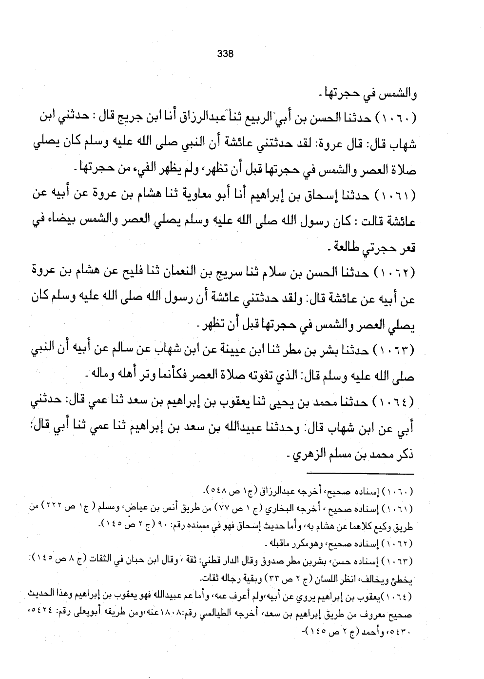 1060 - حَدَّثَنَا الْحَسَنُ بْنُ أَبِي الرَّبِيعِ ثَنَا عَبْدُ الرَّزَّاقِ أَنَا جُرَيْجٌ قَالَ: حَدَّثَنِي ابْنُ شِهَابٍ قَالَ: قَالَ عُرْوَةُ: لَقَدْ حَدَّثَتْنِي عَائِشَةُ أَنّ النَّبِيَّ صَلَّى اللهُ عَلَيْهِ وَسَلَّمَ كَانَ يُصَلِّي صَلاةَ الْعَصْرِ وَالشَّمْسُ فِي حُجْرَتِهَا قَبْلَ أَنْ تَظْهَرَ، وَلَمْ يَظْهَرِ الْفَيْءُ مِنْ حُجْرَتِهَا.