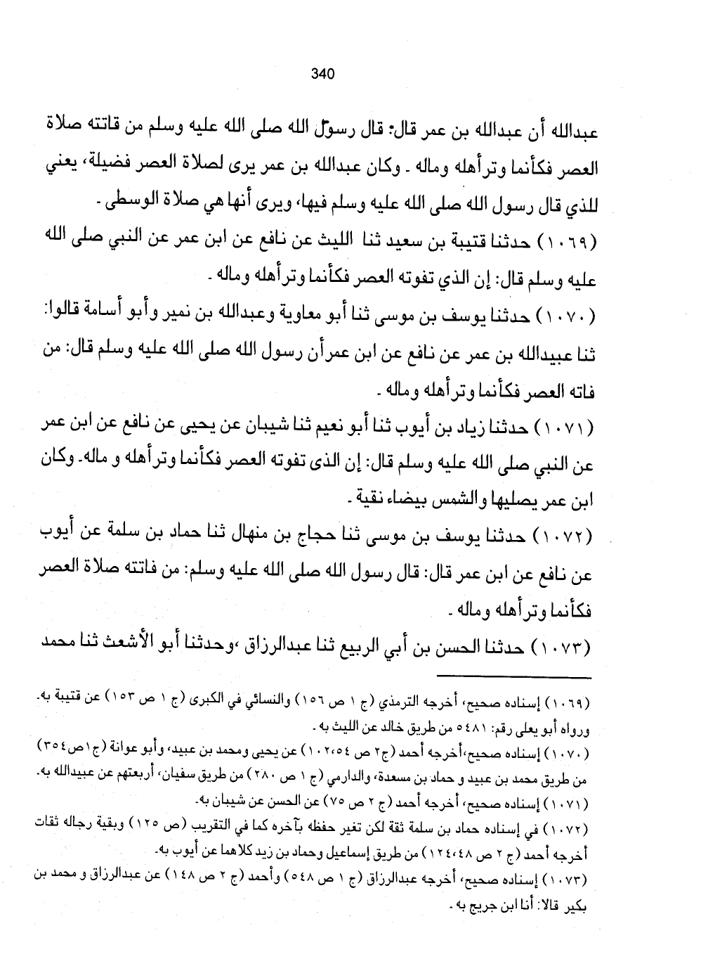 1070 - حَدَّثَنَا يُوسُفُ بْنُ مُوسَى ثَنَا أَبُو مُعَاوِيَةَ وَعَبْدُ اللَّهِ بْنُ نُمَيْرٍ وَأَبُو أُسَامَةَ قَالُوا: ثَنَا عُبَيْدُ اللَّهِ بْنُ عُمَرَ عَنْ نَافِعٍ عَنِ ابْنِ عُمَرَ أَنّ رَسُولَ اللَّهِ صَلَّى اللهُ عَلَيْهِ وَسَلَّمَ قَالَ: مَنْ فَاتَهُ الْعَصْرُ فَكَأَنَّمَا وَتَرَ أَهْلَهُ وَمَالَهُ.