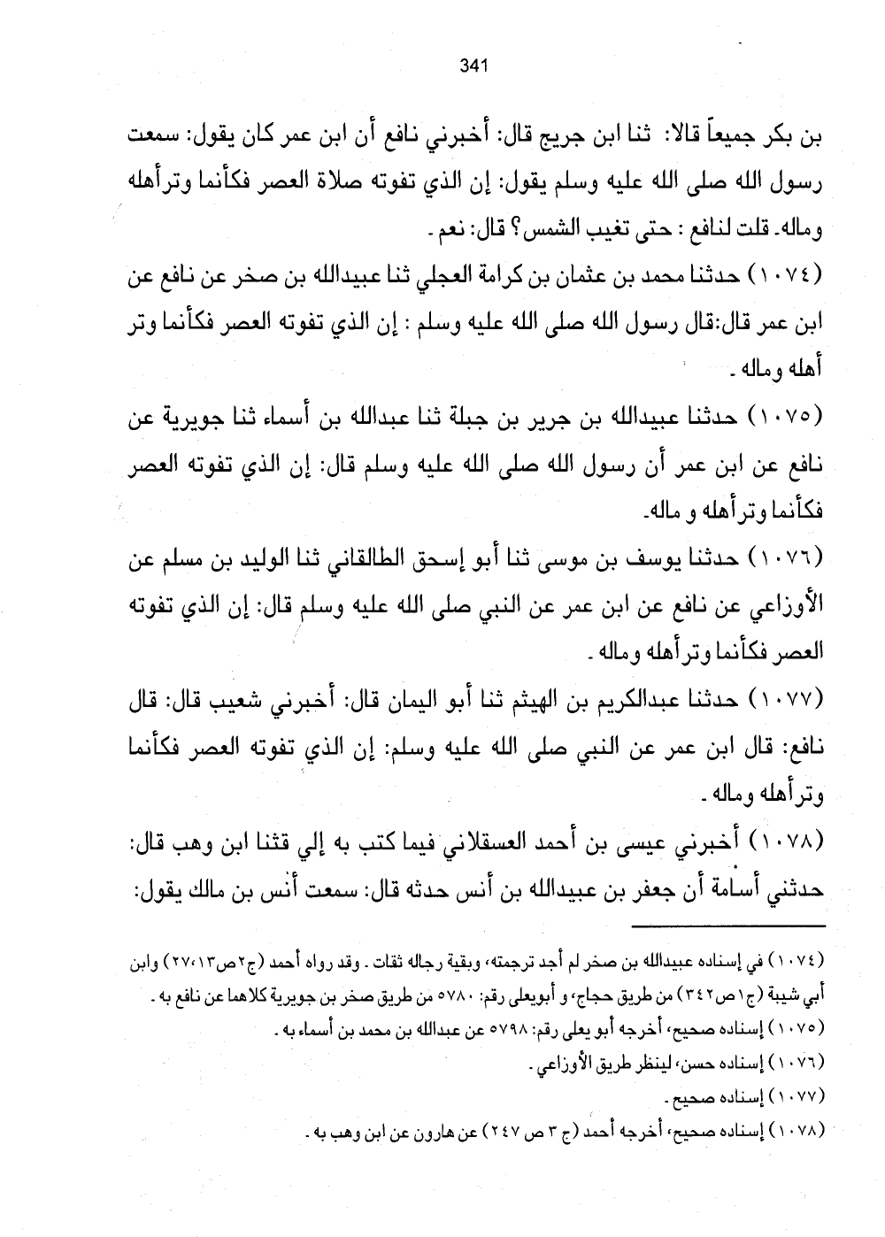 1077 - حَدَّثَنَا عَبْدُ الْكَرِيمِ بْنُ الْهَيْثَمِ ثَنَا أَبُو الْيَمَانِ قَالَ: أَخْبَرَنِي شُعَيْبٌ قَالَ: قَالَ نَافِعٌ: قَالَ ابْنُ عُمَرَ عَنِ النَّبِيِّ صَلَّى اللهُ عَلَيْهِ وَسَلَّمَ ك إِنَّ الَّذِي تَفُوتُهُ الْعَصْرُ فَكَأَنَّمَا وَتَرَ أَهْلَهُ وَمَالَهُ.