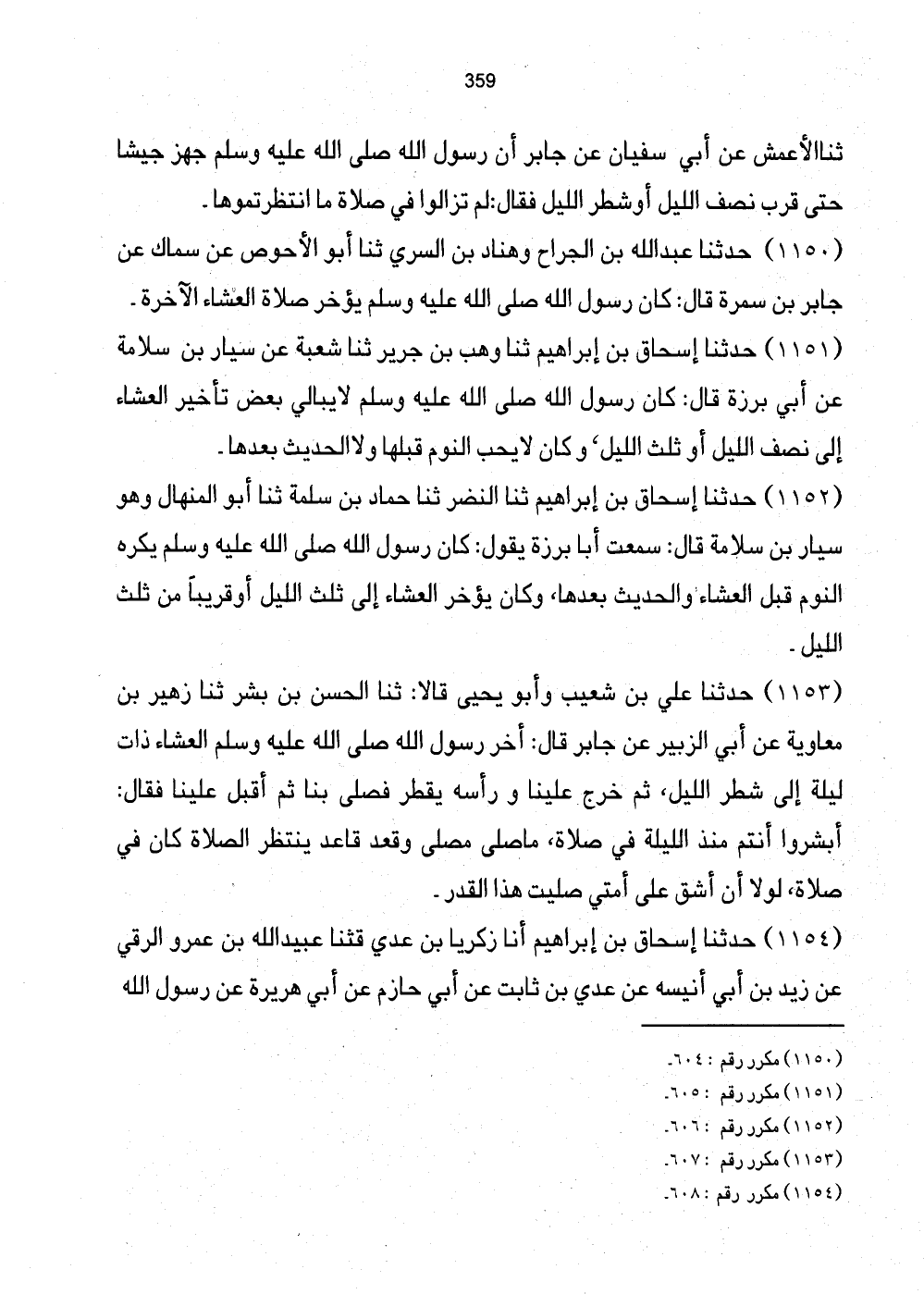 1151 - حَدَّثَنَا إِسْحَاق بْنُ إِبْرَاهِيمَ ثَنَا وَهْبُ بْنُ جَرِيرٍ ثَنَا شُعْبَةُ عَنْ سَيَّارِ، سَلامَةُ عَنْ جَابِرٍ بْنِ سَلامَةَ عَنْ أَبِي بَرْزَةَ قَالَ: كَانَ رَسُولُ اللَّهِ صَلَّى اللهُ عَلَيْهِ وَسَلَّمَ لَا يُبَالِي بَعْضَ تَأْخِيرِ الْعِشَاءِ إِلَى نِصْفِ اللَّيْلِ أَوْ ثُلُثِ اللَّيْلِ، وَكَانَ لَا يُحِبُّ النَّوْمَ قَبْلَهَا وَلا الْحَدِيثَ بَعْدَهَا.