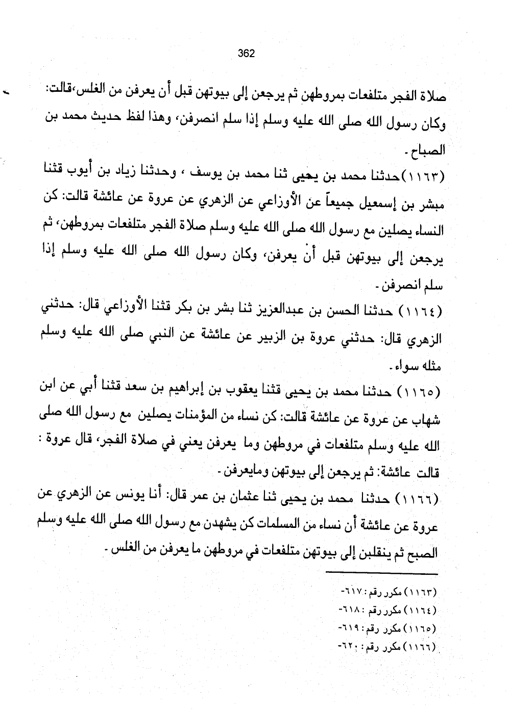 1166 - حَدَّثَنَا مُحَمَّدُ بْنُ يَحْيَى ثَنَا عُثْمَانُ بن عمر ال: أَنَا يُونُسُ عَنِ الزُّهْرِيِّ عَنْ عُرْوَةَ عَنْ عَائِشَةَ أَنَّ نِسَاءً مِنَ الْمُسْلِمَاتِ كُنَّ يَشْهَدْنَ مَعَ رَسُول الله صَلَّى اللهُ عَلَيْهِ وَسَلَّمَ اصبح ثُمَّ يَنْقَلِبْنَ إِلَى بُيُوتِهِنَّ مُتَلَفِّعَاتٍ فِي مُرُوطِهِنَّ مَا يُعْرَفْنَ مِنَ الْغَلَسِ.