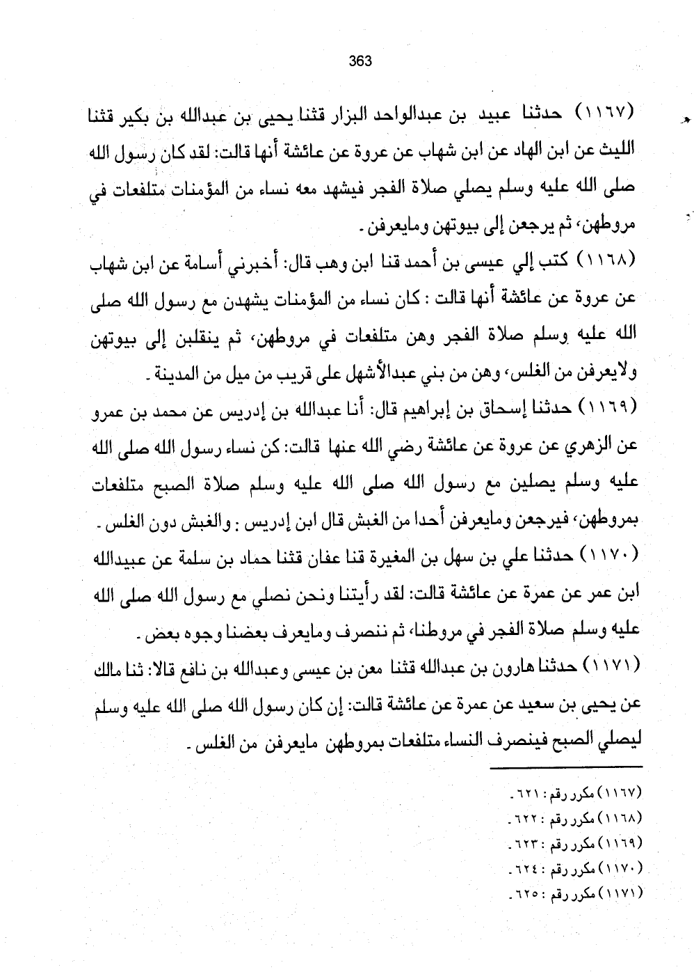 1167 - حَدَّثَنَا عُبَيْدُ بْنُ عَبْدِ الْوَاحِدِ الْبَزَّارُ قثنا يَحْيَى بْنُ عَبْدِ اللَّهِ بْنِ بُكَيْرٍ قثنا اللَّيْثُ عَنِ ابْنِ الْهَادِ عَنِ ابْنِ شِهَابٍ عَنْ عُرْوَةَ عَنْ عَائِشَةَ أَنَّهَا قَالَتْ: لَقَدْ كَانَ رَسُولُ اللَّهِ صَلَّى اللهُ عَلَيْهِ وَسَلَّمَ يَصَلِّي صَلاةَ الْفَجْرِ فَيَشْهَدُ مَعَهُ نِسَاءٌ مِنَ الْمُؤْمِنَاتِ مُتَلَفِّعَاتٍ فِي مُرُوطِهِنَّ، ثُمَّ يَرْجِعْنَ إِلَى بُيُوتِهِنَّ وَمَا يُعْرَفْنَ.