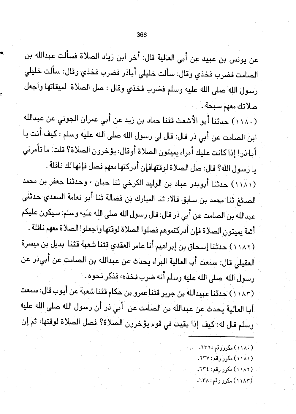 1183 - حَدَّثَنَا عُبَيْدُ اللَّهِ بْنُ جَرِيرٍ قثنا عَمْرُو بْنُ حَكَامٍ قثنا شُعْبَةُ عَنْ أَيُّوبَ قَالَ: سَمِعْتُ أَبَا الْعَالِيَةِ يُحَدِّثُ عَنْ عَبْدِ اللَّهِ بْنِ الصَّامِتِ عَنْ أَبِي ذَرٍّ أَنَّ رَسُولَ اللَّهِ صَلَّى اللهُ عَلَيْهِ وَسَلَّمَ قَالَ لَهُ: كَيْفَ إِذَا بَقِيتَ فِي قَوْمٍ يُؤَخِّرُونَ الصَّلاةَ؟ فَصَلِّ الصَّلاةَ لِوَقْتِهَا، ثُمَّ إِنْ