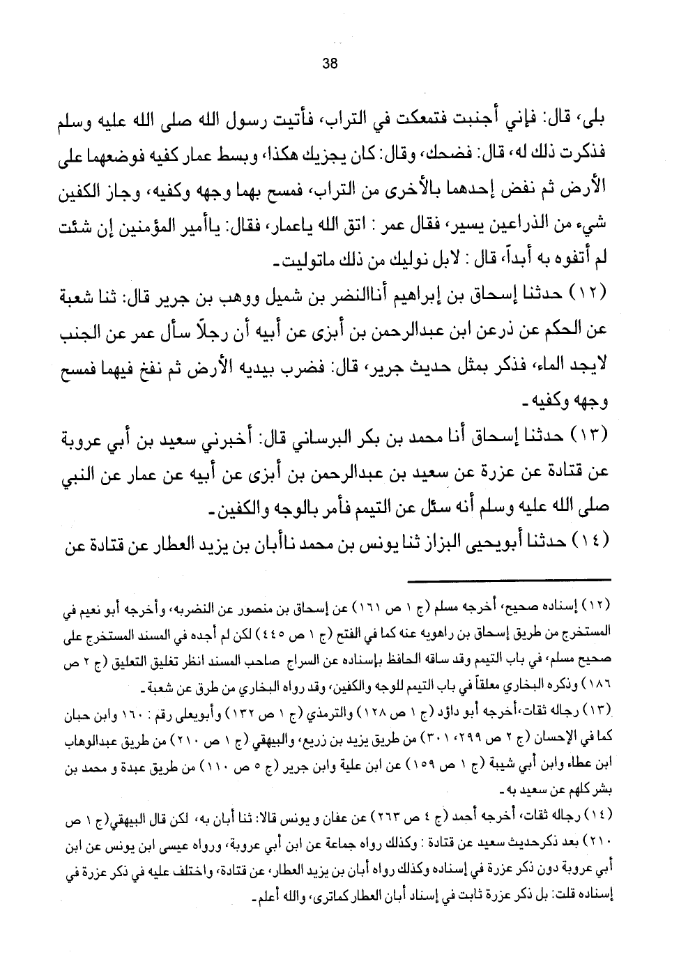 [12] إِسْنَاده صَحِيح، أخرجه مُسلم (ج1 ص161) عَن إِسْحَاق بن مَنْصُور عَن النضربه، وَأخرجه أَبُو نعيم فِي الْمُسْتَخْرج من طَرِيق إِسْحَاق بن روهوية عَنهُ كَمَا فِي الْفَتْح (ج1 ص445) لَكِن لم أَجِدهُ فِي الْمسند الْمُسْتَخْرج على صَحِيح مُسلم، فِي بَاب التَّيَمُّم وَقد صاقه الْحَافِظ بِإِسْنَادِهِ عَن السراج صَاحب الْمسند انْظُر تغليق التَّعْلِيق (ج2 ص186) وَذكره البُخَارِيّ مُعَلّقا فِي بَاب التَّيَمُّم للْوَجْه وَالْكَفَّيْنِ، وَقد رَوَاهُ البُخَارِيّ من طرق عَن شُعْبَة.