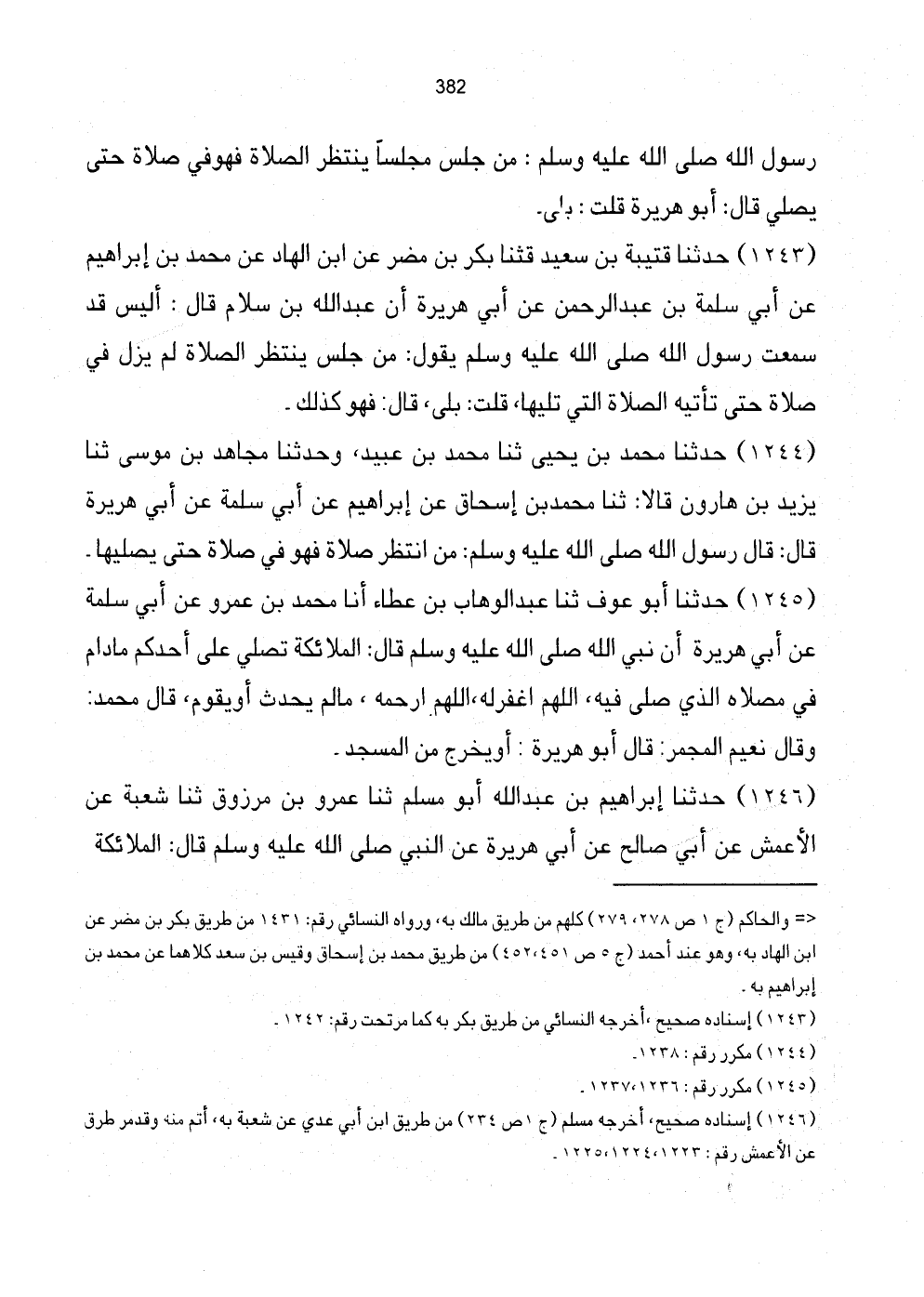 1243 - حَدَّثَنَا قُتَيْبَةُ بْنُ سَعِيدٍ قثنا بَكْرُ بْنُ مُضَرٍ عَنِ ابْنِ الْهَادِ عَنْ مُحَمَّدِ بْنِ إِبْرَاهِيمَ عَنْ أَبِي سَلَمَةَ بْنِ عَبْدِ الرَّحْمَنِ عَنْ أَبِي هُرَيْرَةَ أَنَّ عَبْدَ اللَّهِ بْنَ سَلامٍ قَالَ: أَلَيْسَ قَدْ سَمِعْتَ رَسُولَ اللَّهِ صَلَّى اللهُ عَلَيْهِ وَسَلَّمَ يَقُولُ: مَنْ جَلَسَ يَنْتَظِرُ الصَّلاةَ لَمْ يَزَلْ فِي صَلاةٍ حَتَّى تَأْتِيهِ الصَّلاةُ الَّتِي تَلِيهَا، قُلْتُ: بَلَى، قَالَ: فَهُوَ كَذَلِكَ.