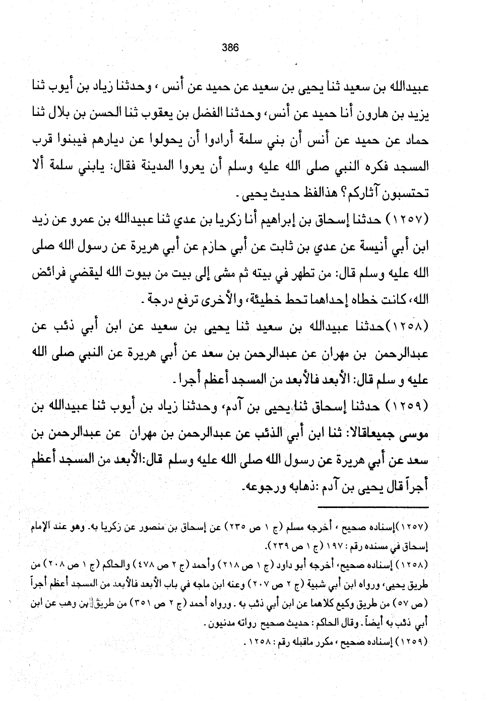 عُبَيْدُ اللَّهِ بْنُ سَعِيدٍ ثَنَا يَحْيَى بْنُ سَعِيدٍ عَنْ حُمَيْدٍ عَنْ أَنَسٍ، وَحَدَّثَنَا زِيَادُ بْنُ أَيُّوبَ ثَنَا يَزِيدُ بْنُ هَارُونَ أَنَا حُمَيْدٌ عَنْ أَنَسٍ، وَحَدَّثَنَا الْفَضْلُ بْنُ يَعْقُوبَ ثَنَا الْحَسَنُ بْنُ بِلالٍ ثَنَا حَمَّادٌ عَنْ حُمَيْدٍ عَنْ أَنَسٍ أَنَّ بَنِي سَلَمَةَ أَرَادُوا أَنْ يَحُولُوا عَنْ دِيَارِهِمْ فَيَبْنُوا قُرْبَ الْمَسْجِدِ فَكَرِهَ النَّبِيُّ صَلَّى اللهُ عَلَيْهِ وَسَلَّمَ أَنْ يُعْرُوا الْمَدِينَةَ فَقَالَ: يَا بَنِي سَلَمَةَ أَلا تَحْتَسِبُونَ آثَاركُم؟ هَذَا الْفظ حَدِيثُ يَحْيَى.