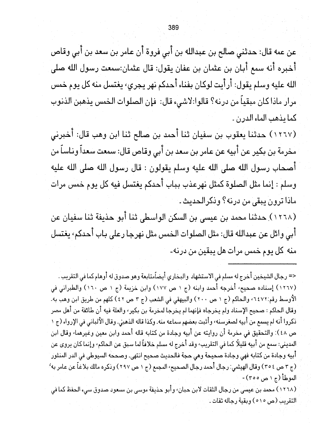 [1267] إِسْنَاده صَحِيح، أخرجه أَحْمد وَابْنه (ج1 ص177) وَابْن خُزَيْمَة (ج1 ص160) وَالطَّبَرَانِيّ فِي الْأَوْسَط رقم: 6472، وَالْحَاكِم (ج1 ص200) وَالْبَيْهَقِيّ فِي الشّعب (ج3 ص42) كلهم من طَرِيق ابْن وهب بِهِ. وَقَالَ الْحَاكِم: صَحِيح الْإِسْنَاد وَلم يخرجَاهُ فَإِنَّهُمَا لم يخرجَا لمخرمة بن بكير، وَالْعلَّة فِيهِ أَن طَائِفَة من أهل مصر ذكرُوا أَنه لم يسمع من أَبِيه لصِغَر سنه، وَأثبت بَعضهم سَمَاعه مِنْهُ، وَكَذَا قَالَه الذَّهَبِيّ. وَقَالَ الألباني فِي الإرواء (ج1 ص48) : وَالتَّحْقِيق فِي مخرمَة أَن رِوَايَته عَن أَبِيه وجادة من كِتَابه قَالَه أَحْمد وَابْن معِين وَغَيرهمَا، وَقَالَ ابْن الْمَدِينِيّ: سمع من أَبِيه قَلِيلا كَمَا فِي التَّقْرِيب، وَقد أخرج لَهُ مُسلم خلافًا لما سبق عَن الْحَاكِم، وَإِنَّمَا كَانَ يروي عَن أَبِيه وجادة صَحِيحَة وَهِي حجَّة فَالْحَدِيث صَحِيح انْتهى. وصححها السُّيُوطِيّ فِي الدّرّ المنثور (ج3 ص354) وَقَالَ الهيثمي: رجال أَحْمد رجال الصَّحِيح، الْمجمع (ج1 ص297) وَذكره مَالك بلاغاً عَن عَامر بِهِ، الْمُوَطَّأ (ج1 ص355) .