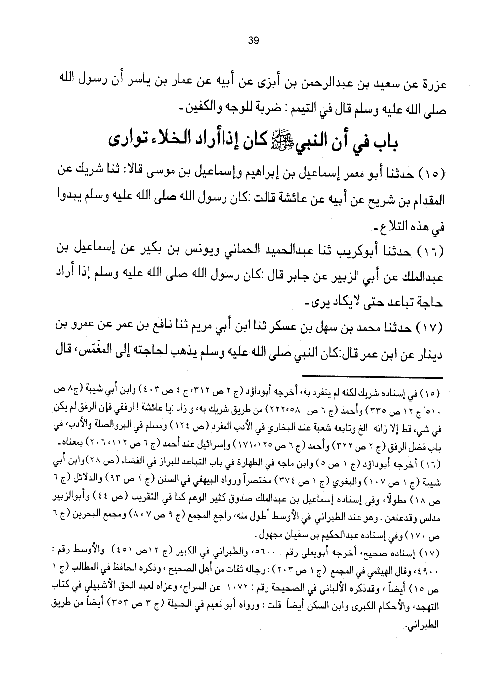 16 - حَدَّثَنَا أَبُو كُرَيْبٍ ثَنَا عَبْدُ الْحَمِيدِ الْحِمَّانِيُّ وَيُونُسُ بْنُ بُكَيْرٍ عَنْ إِسْمَاعِيلَ بْنِ عَبْدِ الْمَلِكِ عَنْ أَبِي الزُّبَيْرِ عَنْ جَابِرٍ قَالَ: كَانَ رَسُولُ اللَّهِ صَلَّى اللهُ عَلَيْهِ وَسَلَّمَ إِذَا أَرَادَ حَاجَةً تَبَاعَدَ حَتَّى لَا يَكَادُ يُرَى.