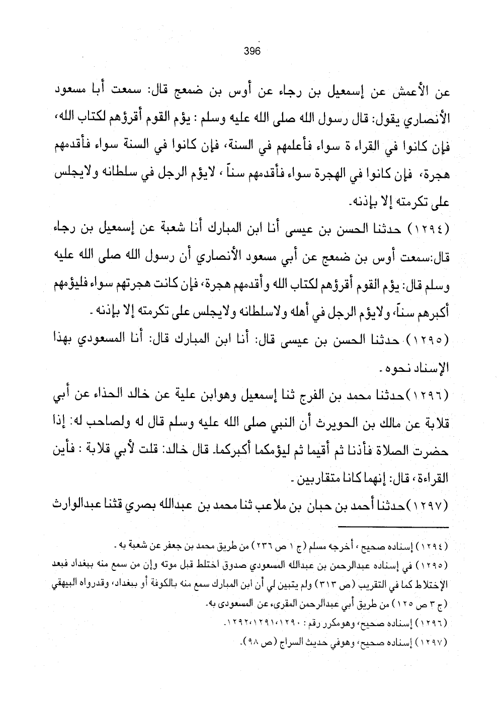 1294 - حَدَّثَنَا الْحَسَنُ بْنُ عِيسَى أَنَا ابْنُ الْمُبَارَكِ أَنَا شُعْبَة عَن إِسْمَعِيل بْنِ رَجَاءٍ قَالَ: سَمِعْتُ أَوْسَ بْنَ ضَمْعَجٍ عَنْ أَبِي مَسْعُودٍ الأَنْصَارِيٍّ أَنَّ رَسُولَ اللَّهِ صَلَّى اللهُ عَلَيْهِ وَسَلَّمَ قَالَ: يَؤُمُّ الْقَوْمَ أَقْرَؤُهُمْ لِكِتَابِ اللَّهِ وَأَقْدَمُهُمْ هِجْرَةً، فَإِنْ كَانَتْ هِجْرَتُهُمْ سَوَاءً فَلْيَؤُمُّهُمْ أَكْبَرُهُمْ سِنًّا، وَلا يُؤَمُّ الرَّجُلُ فِي أَهْلِهِ وَلا سُلْطَانِهِ وَلا يُجْلَسُ عَلَى تَكْرُمَتِهِ إِلا بِإِذْنِهِ.