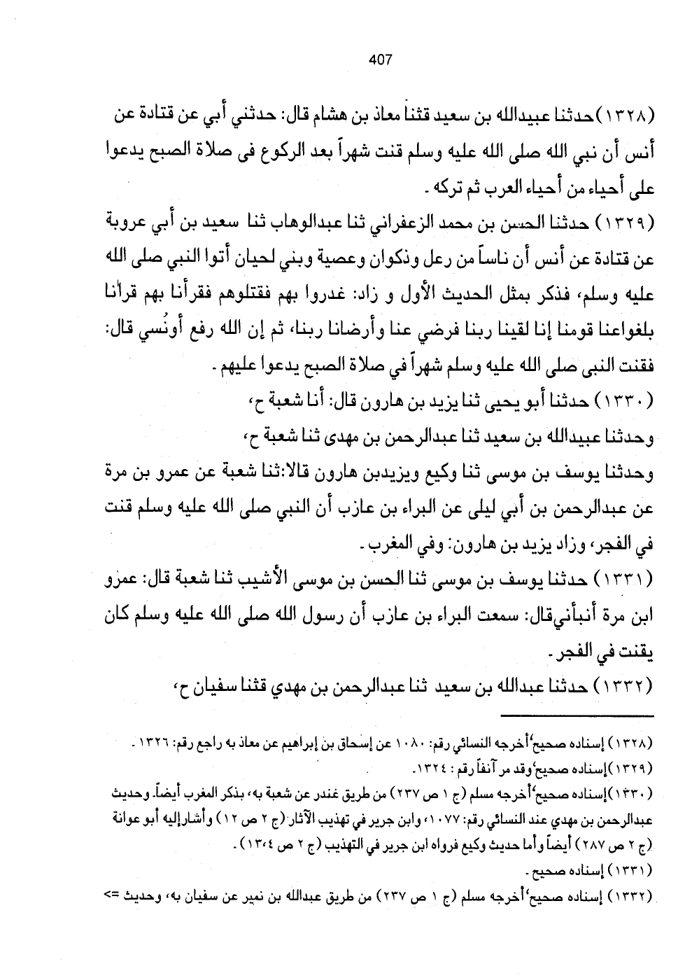 1331 - حَدَّثَنَا يُوسُفُ بْنُ مُوسَى ثَنَا الْحَسَنُ بْنُ مُوسَى الأَشْيَبُ ثَنَا شُعْبَةُ قَالَ: عَمْرُو ابْن مَرْوَةَ أَنْبَأَنِي قَالَ: سَمِعْتُ الْبَرَاءَ بْنَ عَازِبٍ أَنّ رَسُولَ اللَّهِ صَلَّى اللهُ عَلَيْهِ وَسَلَّمَ كَانَ يَقْنُتُ فِي الْفَجْرِ.
