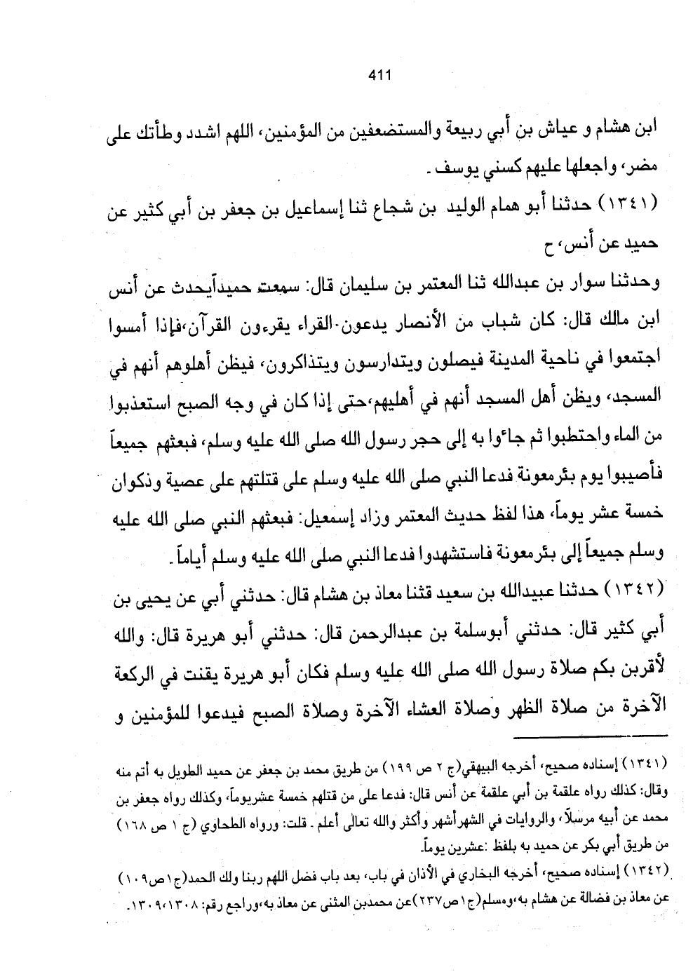 [1341] إِسْنَاده صَحِيح، أخرجه الْبَيْهَقِيّ (ج2 ص199) من طَرِيق مُحَمَّد بن جَعْفَر عَن حميد الطَّوِيل بِهِ أتم مِنْهُ وَقَالَ: كَذَلِك رَوَاهُ عَلْقَمَة بن أبي عَلْقَمَة عَن أنس قَالَ: فَدَعَا على من قَتلهمْ خَمْسَة عشر يَوْمًا، وَكَذَلِكَ رَوَاهُ جَعْفَر بن مُحَمَّد بن أَبِيه مُرْسلا، وَالرِّوَايَات فِي الشَّهْر أشهر وَأكْثر وَالله تَعَالَى أعلم. قلت: وَرَوَاهُ الطَّحَاوِيّ (ج1 ص168) .