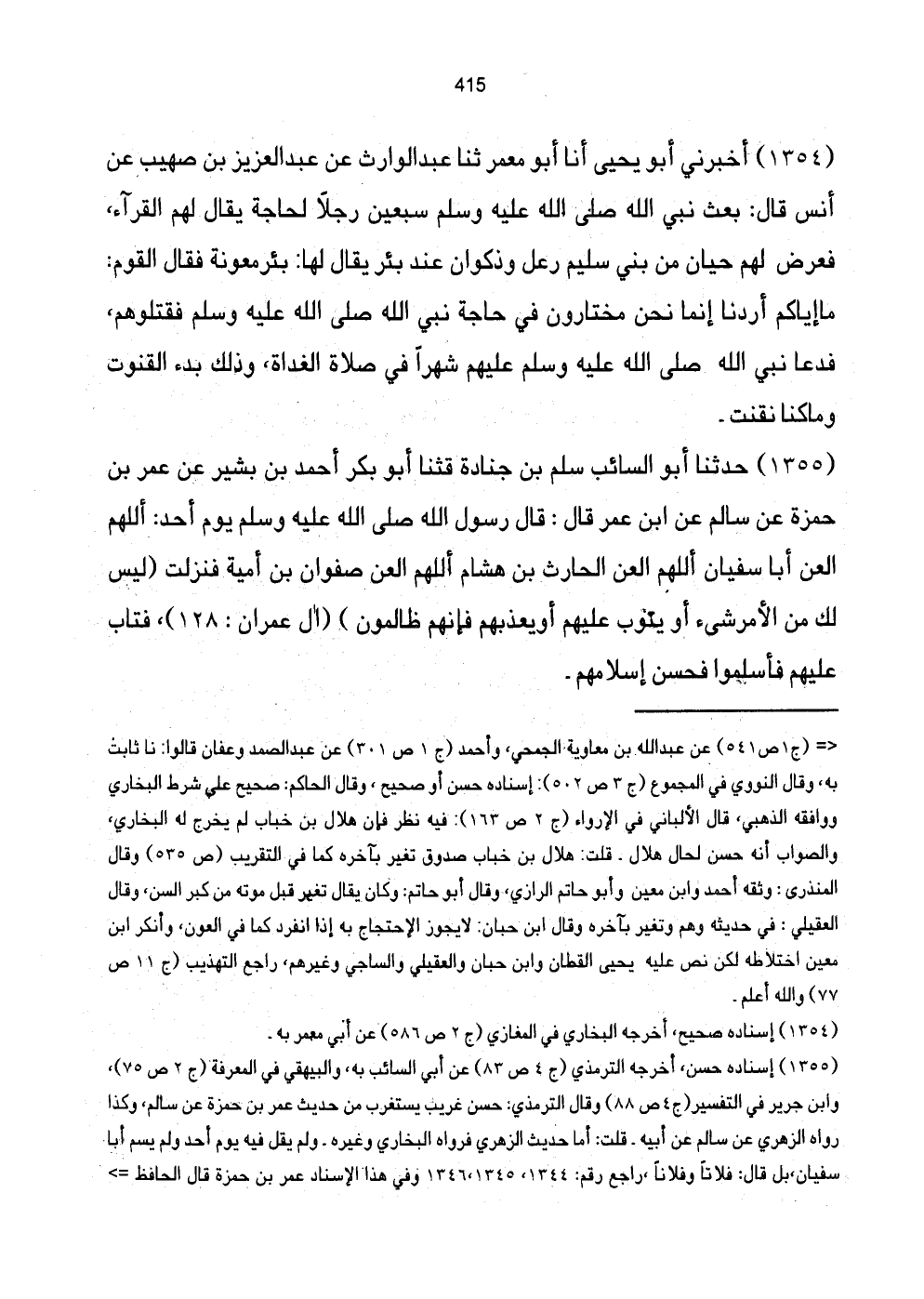 [1355] إِسْنَاده حسن، أخرجه التِّرْمِذِيّ (ج4 ص83) عَن أبي السَّائِب بِهِ , الْبَيْهَقِيّ فِي الْمعرفَة (ج2 ص75) وَابْن جرير فِي التَّفْسِير (ج4 ص88) وَقَالَ التِّرْمِذِيّ: حسن غَرِيب يستغرب من حَدِيث عمر بن حَمْزَة عَن سَالم، وَكَذَا رَوَاهُ الزُّهْرِيّ عَن سَالم عَن أَبِيه. قلت: أما حَدِيث الزُّهْرِيّ فَرَوَاهُ البُخَارِيّ وَغَيره. وَلم يقل فِيهِ يَوْم أحد وَلم يسم أَبَا سُفْيَان، بل قَالَ: فلَانا وَفُلَانًا، رَاجع رقم: 1344، 1345، 1346 وَفِي هَذَا الإسنا مر بن حَمْزَة قَالَ الْحَافِظ =