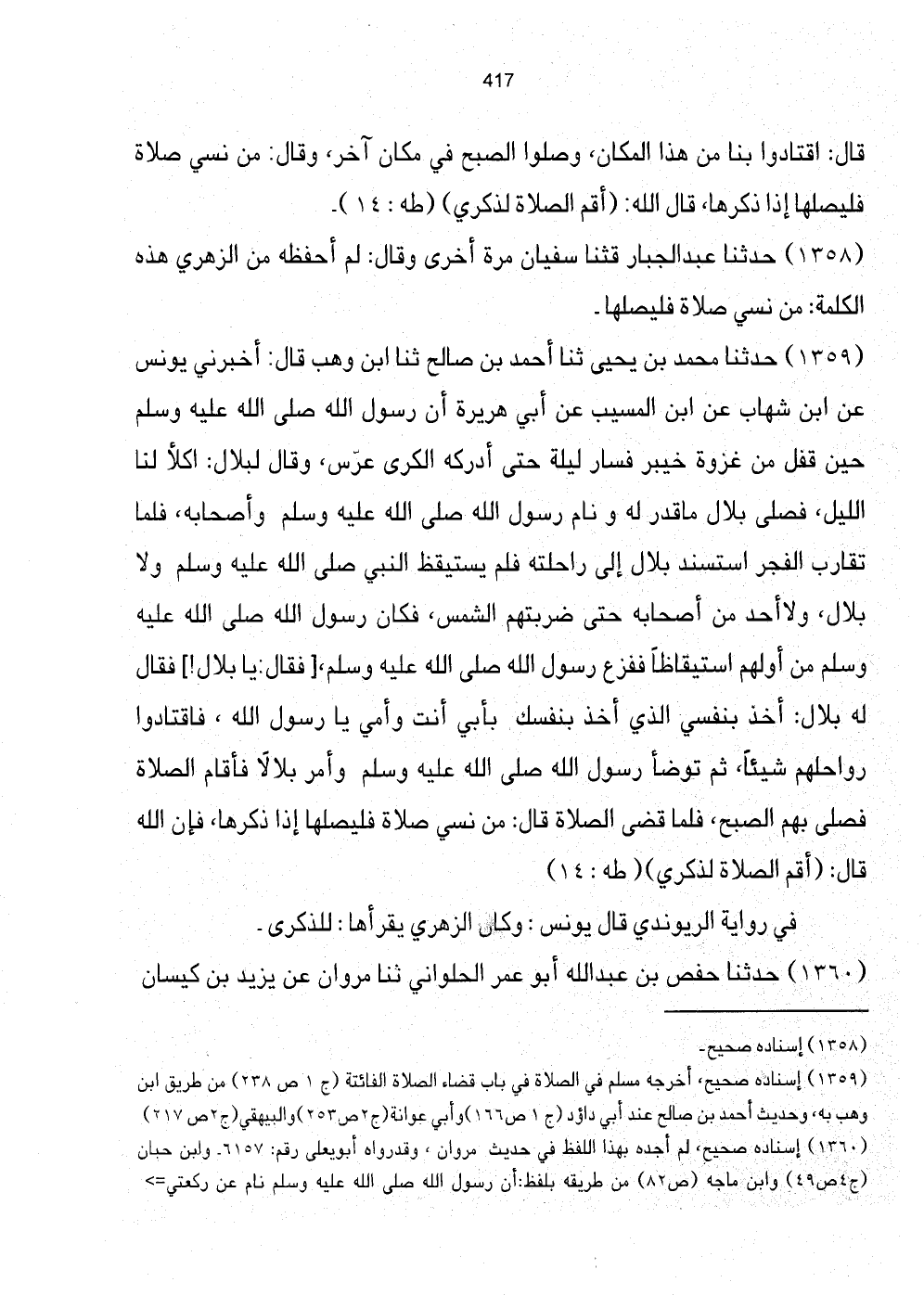 [1359] إِسْنَاده صَحِيح، أخرجه مُسلم فِي الصَّلَاة فِي بَاب قَضَاء الْفَائِتَة (ج1 ص238) من طَرِيق ابْن وهب بِهِ، وَحَدِيث أَحْمد بن صَالح عِنْد أبي داؤد (ج1 ص166) وابي عوَانَة (ج2 ص253) وَالْبَيْهَقِيّ (ج2 ص217) .