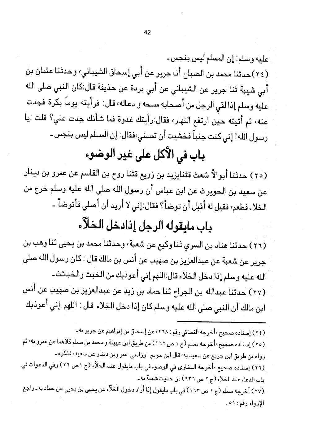 24 - حَدَّثَنَا مُحَمَّدُ بْنُ الصَّبَّاحِ أَنَا جَرِيرٌ عَنْ أَبِي إِسْحَاقَ الشَّيْبَانِيِّ، وَحَدَّثَنَا عُثْمَانُ بْنُ أَبِي شَيْبَةَ ثَنَا جَرِيرٌ عَنِ الشَّيْبَانِيِّ عَنْ أَبِي بُرْدَةَ عَنْ حُذَيْفَةَ قَالَ: كَانَ النَّبِيُّ صَلَّى اللهُ عَلَيْهِ وَسَلَّمَ إِذَا لَقِيَ الرَّجُلَ مِنْ أَصْحَابِهِ مَسَحَهُ وَدَعَا لَهُ، قَالَ: فَرَأَيْتُهُ يَوْمًا بُكْرَةً فَحِدْتُ عَنْهُ، ثُمَّ أَتَيْتُهُ حِينَ ارْتَفَعَ النَّهَارُ، فَقَالَ: رَأَيْتُكَ غُدْوَةً فَمَا شَأْنُكَ حِدْتَ عَنِّي؟ قُلْتُ: يَا رَسُولَ اللَّهِ! إِنِّي كُنْتُ جُنُبًا فَخَشِيتُ أَنْ تَمَسَّنِي، فَقَالَ: إِنَّ الْمُسْلِمَ لَيْسَ بِنَجِسٍ.