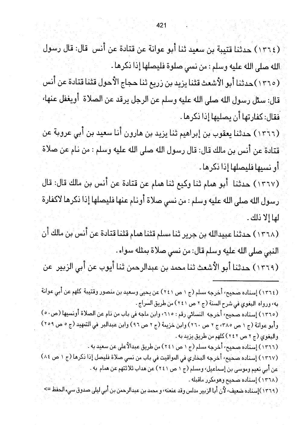 [1367] إِسْنَاده صَحِيح، أخرجه البُخَارِيّ فِي الْمَوَاقِيت فِي بَاب من نسي صَلَاة فَليصل إِذا ذكرهَا (ج1 ص84) عَن أبي نعيم ومُوسَى بن إِسْمَاعِيل، وَمُسلم (ج1 ص241) عَن هداب ثَلَاثَتهمْ عَن همام بِهِ.