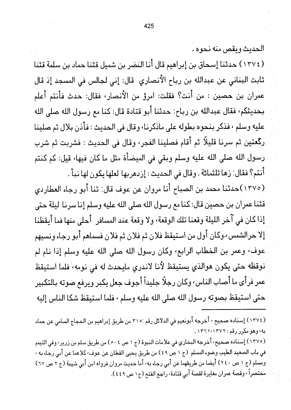 [1375] إِسْنَاده صَحِيح، أخرجه البُخَارِيّ فِي عَلَامَات النُّبُوَّة (ج1 ص504) من طري سلم بن زرير، وَفِي التميم فِي بَاب الصَّعِيد الطّيب وضوء الْمُسلم (ج1 ص49) من طَرِيق يحيى الْقطَّان عَن عَوْف، كِلَاهُمَا عَن أبي رَجَاء بِهِ، وَمُسلم (ج1 ص240) أَيْضا من طريقهما عَن أبي رَجَاء بِهِ، أما حَدِيث مَرْوَان فَرَوَاهُ ابْن أبي شيبَة (ج2 ص67) مُخْتَصرا، وقصة عمرَان مُغَايرَة لقصة أبي قَتَادَة، رَاجع الْفَتْح (ج1 ص449) .
