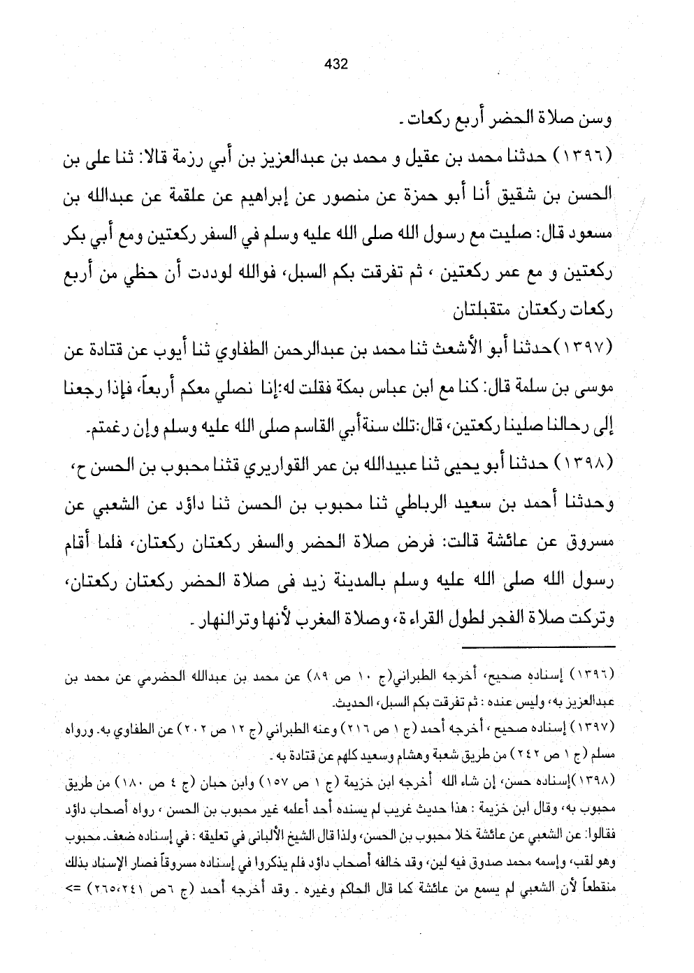 [1398] إِسْنَاده حسن، إِن شَاءَ الله أخرجه ابْن خُزَيْمَة (ج1 ص157) وَابْن حبَان (ج4 ص180) من طَرِيق مَحْبُوب بِهِ، وَقَالَ ابْن خُزَيْمَة: هَذَا حَدِيث غَرِيب لم يسْندهُ أحد أعلمهُ غير مَحْبُوب بن الْحسن، رَوَاهُ اصحاب داؤد فَقَالُوا: عَن الشّعبِيّ عَن عَائِشَة خلا مَحْبُوب بن الْحسن، وَلذَا قَالَ الشَّيْخ الألباني فِي تَعْلِيقه: فِي إِسْنَاده ضعف. مَحْبُوب وَهُوَ لقب، وإسمه مُحَمَّد صَدُوق فِيهِ لين، وَقد خَالفه أَصْحَاب داؤد فَلم يذكرُوا فِي إِسْنَاده مسروقاً فَصَارَ الْإِسْنَاد بذلك مُنْقَطِعًا لِأَن الشّعبِيّ لم يسمع عَن عَائِشَة كَمَا قَالَ الْحَاكِم وَغَيره. وَقد أخرجه أَحْمد (ج6 ص214، 265) =