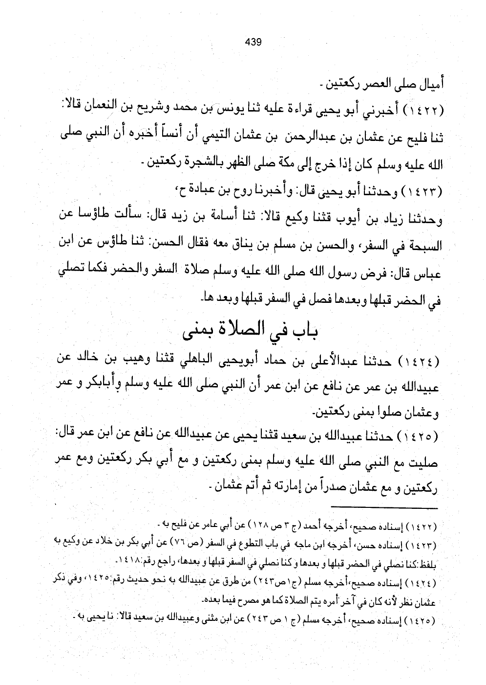 [1424] إِسْنَاده صَحِيح، أخرجه مُسلم (ج1 ص243) من طرق عَن عبيد الله بِهِ نَحْو حَدِيث رقم: 1425، وَفِي ذكر عُثْمَان نظر لِأَنَّهُ كَانَ فِي آخر أمره يتم الصَّلَاة كَمَا هُوَ مُصَرح فِيمَا بعده.