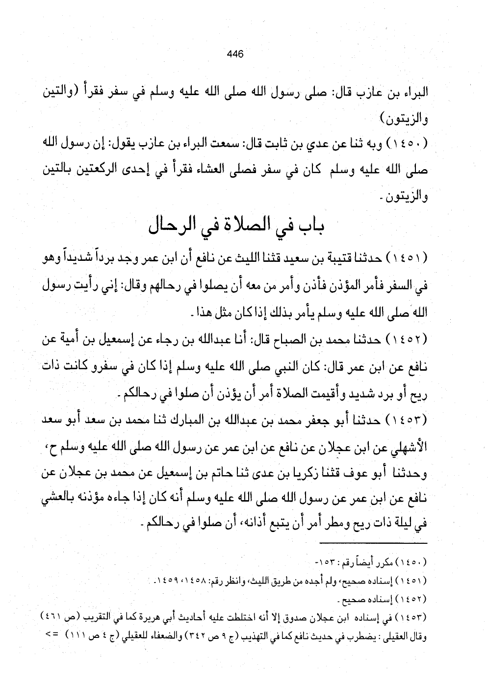 1451 - حَدَّثَنَا قُتَيْبَةُ بْنُ سَعِيدٍ قثنا اللَّيْثُ عَنْ نَافِعٍ أَنَّ ابْنَ عُمَرَ وَجَدَ بَرْدًا شَدِيدًا وَهُوَ فِي السَّفَرِ فَأَمَرَ الْمُؤَذِّنَ فَأَذَّنَ وَأَمَرَ مَنْ مَعَهُ أَنْ يُصَلُّوا فِي رِحَالِهِمْ وَقَالَ: إِنِّي رَأَيْتُ رَسُولَ اللَّهِ صَلَّى اللهُ عَلَيْهِ وَسَلَّمَ يَأْمُرُ بِذَلِكَ إِذَا كَانَ مِثْلُ هَذَا.