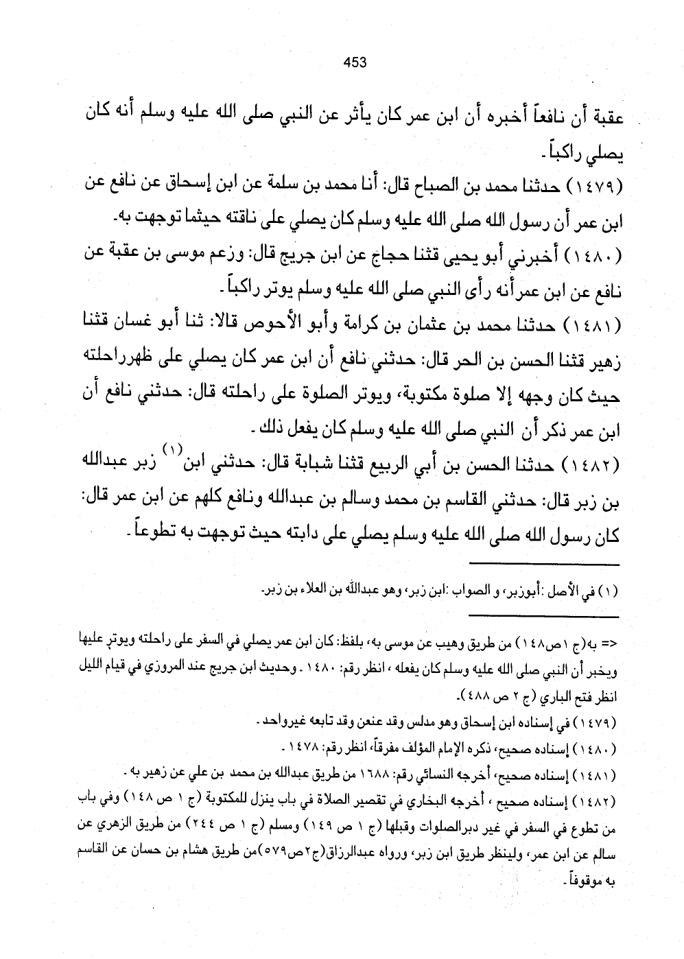 [1482] إِسْنَاده صَحِيح، أخرجه البُخَارِيّ فِي تَقْصِير الصَّلَاة فِي بَاب ينزل للمكتوبة (ج14 ص148) وَفِي بَاب من تطوع فِي السّفر فِي غير دبر الصَّلَوَات وَقبلهَا (ج1 ص149) وَمُسلم (ج1 ص244) من طَرِيق الزُّهْرِيّ عَن سَالم عَن ابْن عمر، ولينظر طَرِيق ابْن زبر، وَرَوَاهُ عبد الرَّزَّاق (ج2ص579) من طَرِيق هِشَام بن حسان عَن الْقَاسِم بِهِ مَوْقُوفا.