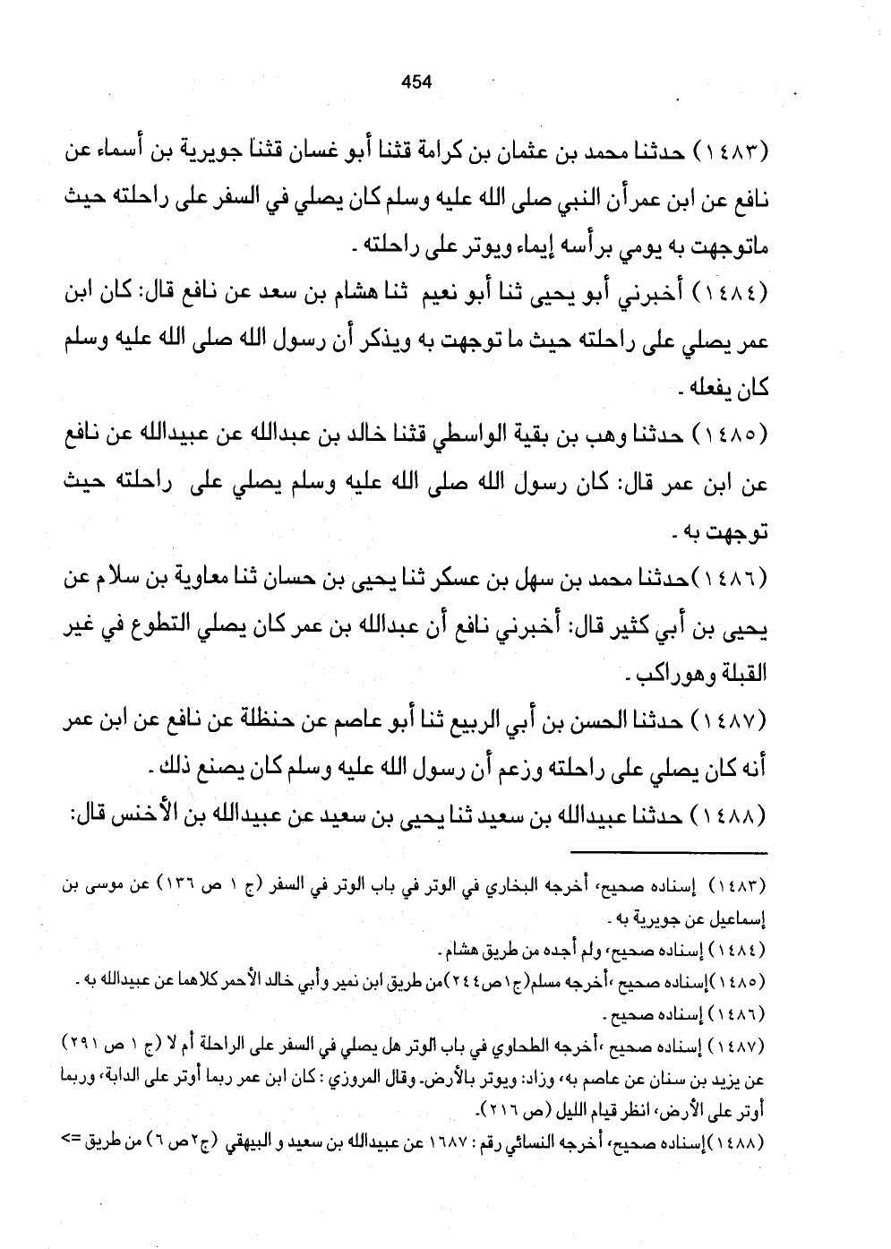 [1487] إِسْنَاده صَحِيح، أخرجه الطَّحَاوِيّ فِي بَاب الْوتر هَل يُصَلِّي فِي السّفر على الرَّاحِلَة أم لَا (ج1 ص291) عَن يزِيد بن سِنَان عَن عَاصِم بِهِ، وَزَاد: ويوتر بِالْأَرْضِ. وَقَالَ الْمروزِي: كَانَ ابْن عمر رُبمَا أوتر على الدَّابَّة، وَرُبمَا أوتر على الأَرْض، انْظُر قيام اللَّيْل (ص216) .