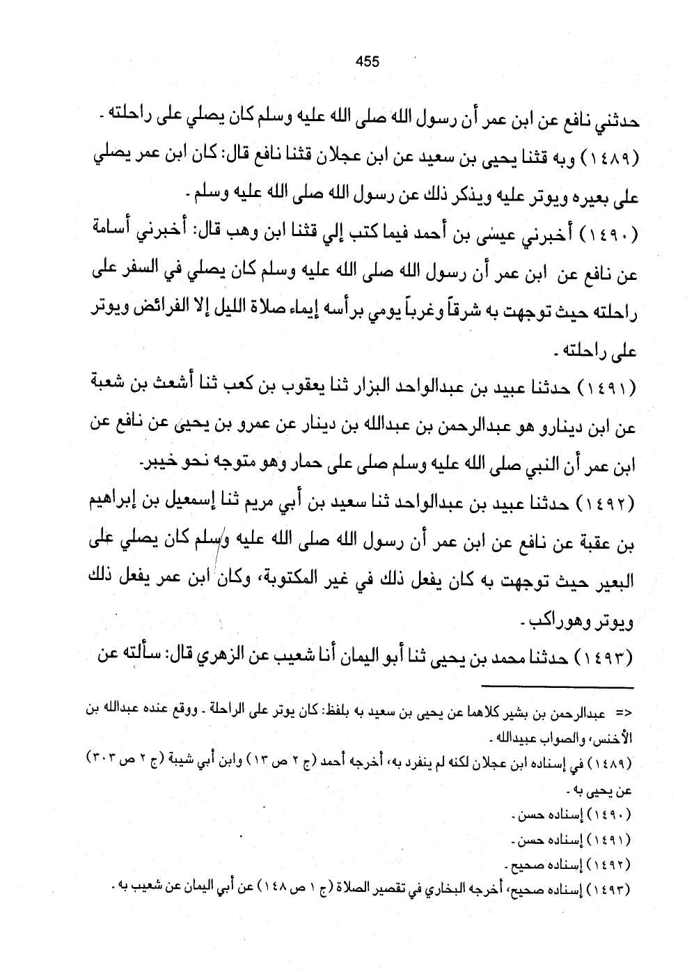 1489 - وَبِهِ قثنا يَحْيَى بْنُ سَعِيدٍ عَنِ ابْنِ عَجْلانَ قثنا نَافِعٌ قَالَ ك كَانَ ابْنُ عُمَرَ يُصَلِّي عَلَى بَعِيرِهِ وَيُوتِرُ عَلَيْهِ وَيَذْكُرُ ذَلِكَ عَنْ رَسُولِ اللَّهِ صَلَّى اللهُ عَلَيْهِ وَسَلَّمَ.