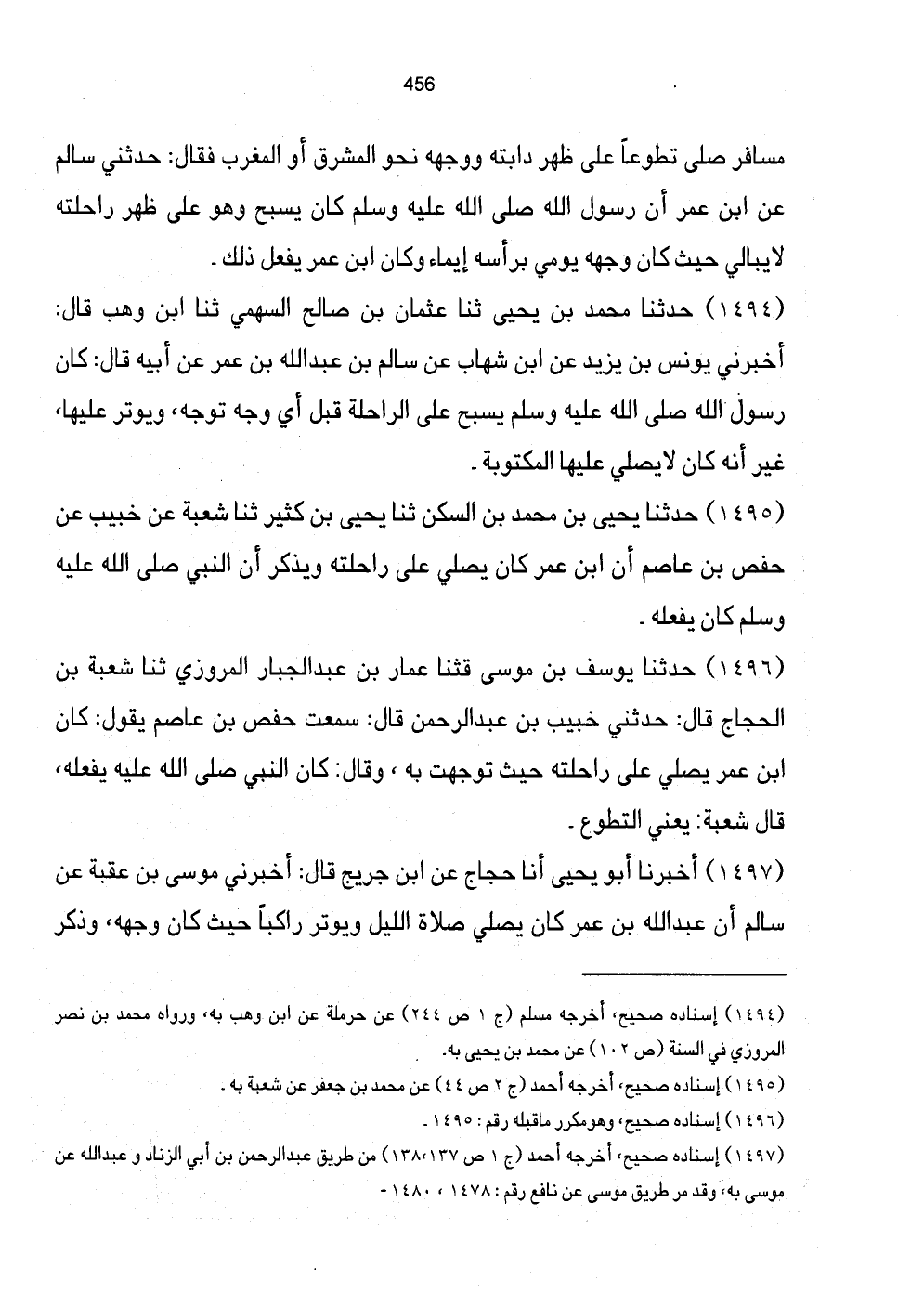 1495 - حَدَّثَنَا يَحْيَى بْنُ مُحَمَّدِ بْنِ السَّكَنِ ثَنَا يَحْيَى بْنُ كَثِيرٍ ثَنَا شُعْبَةُ عَنْ خُبَيْبٍ عَن حَفْص عنبن عَاصِم أَنَّ ابْنَ عُمَرَ كَانَ يُصَلِّي عَلَى رَاحِلَتِهِ وَيَذْكُرُ أَنّ النَّبِيَّ صَلَّى اللهُ عَلَيْهِ وَسَلَّمَ كَانَ يَفْعَلُهُ.